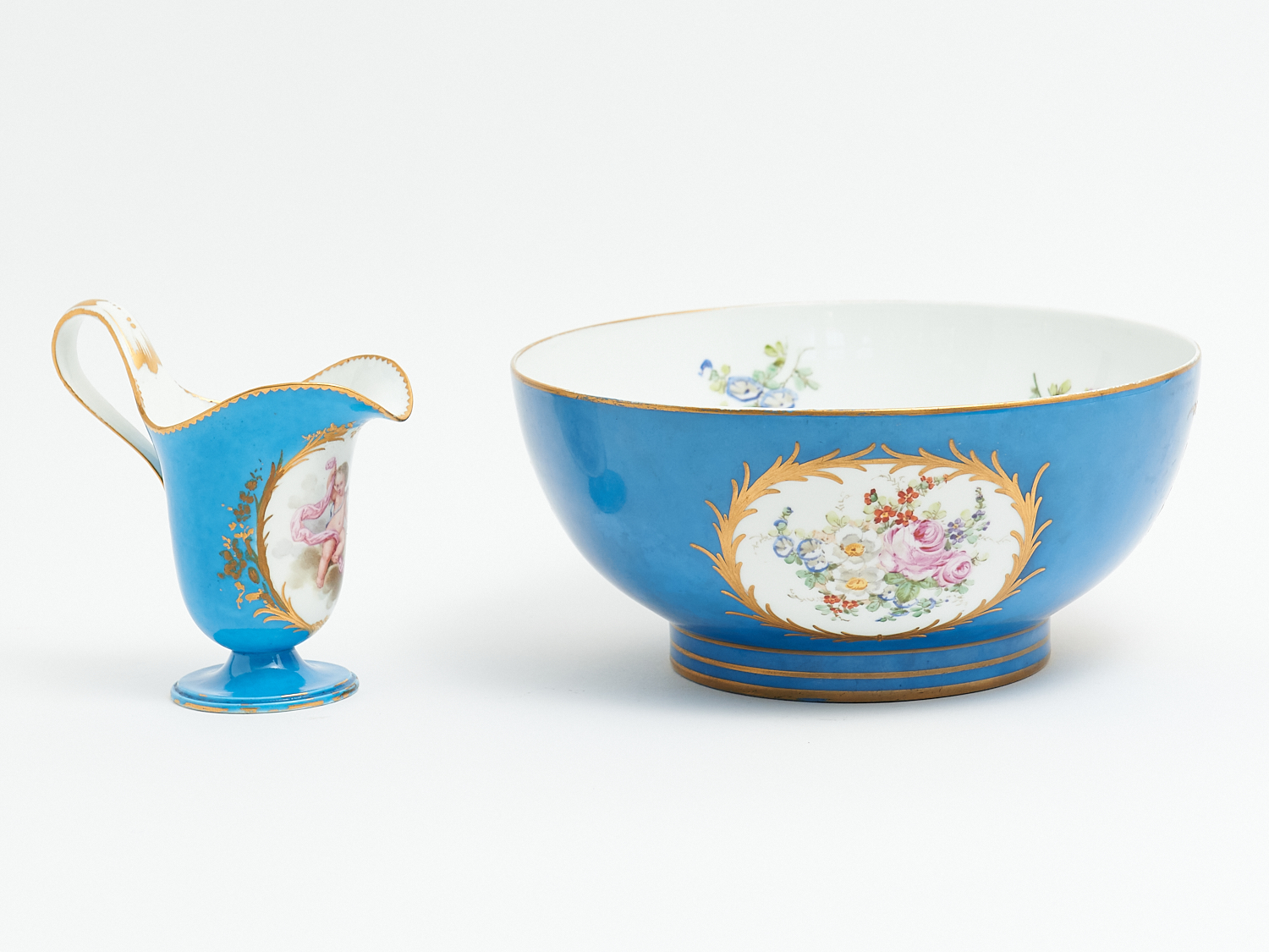 A SEVRES-STYLE PORCELAIN BOWL AND CREAM JUG DIA.25CM (LARGEST), LEONARD JOEL LOCAL DELIVERY: MEDIUM