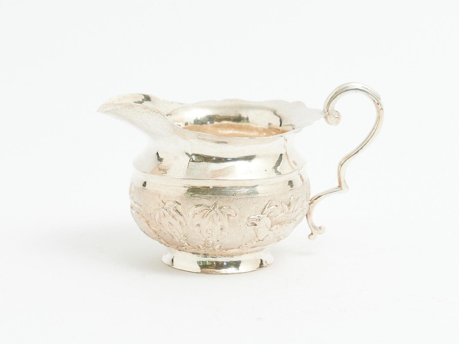 AN INDIAN SILVER ANIMAL DECORATED JUG - 106 GRAMS H.7.5CM, LEONARD JOEL LOCAL DELIVERY: SMALL