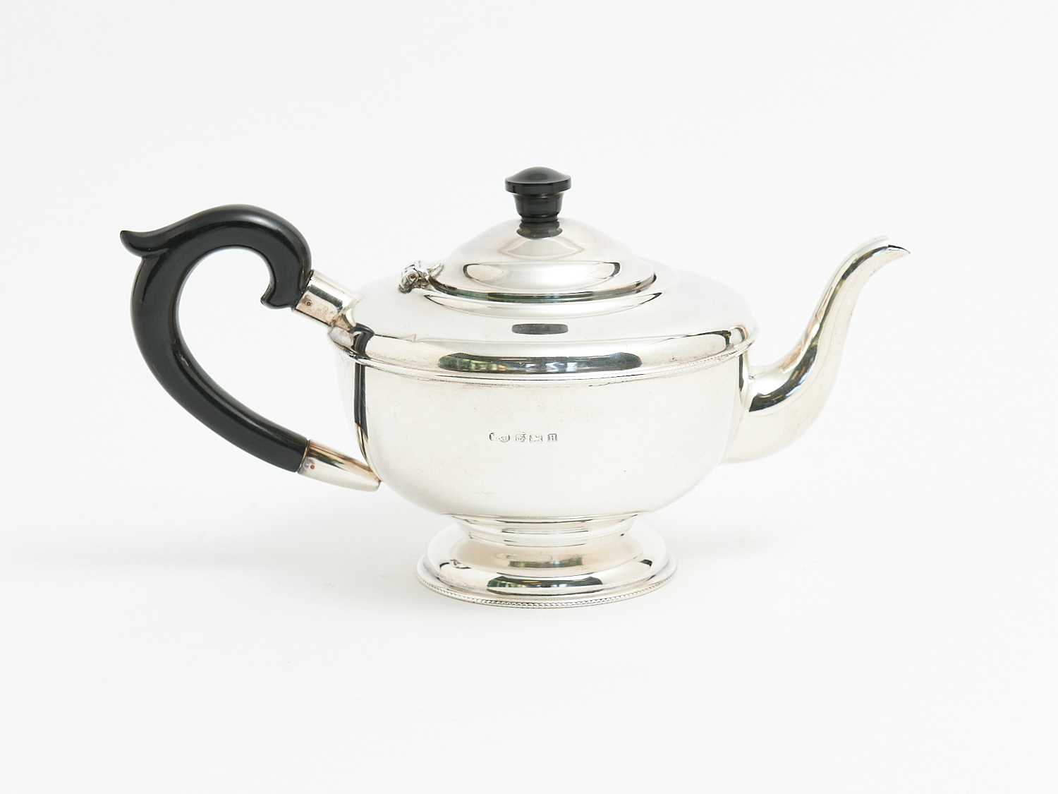 AN ART DECO ENGLISH HALLMARKED STERLING SILVER AND BAKELITE HANDLED TEAPOT – 406 GRAMS, LEONARD JOEL LOCAL DELIVERY: SMALL