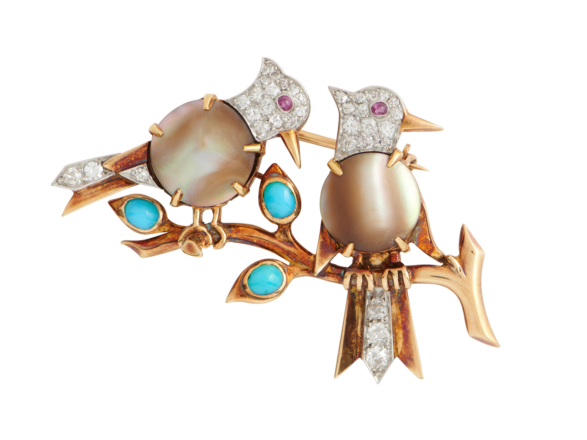Modelled as a pair of birds perched on a branch, with mother-of-pearl and diamond-set bodies and ruby set eyes, with cabochon turquoise detailed leaves, measuring approximately 50mm.