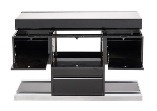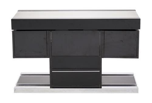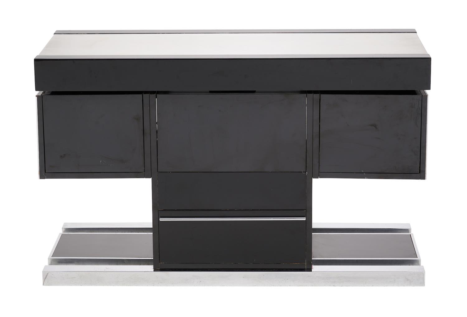 Polished metal and black lacquered timber. Sliding top with internal features and drawers.