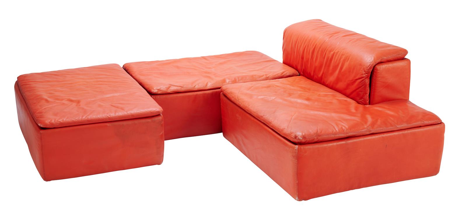 Consists of three modules and a detachable back rest. Red leather and polyurethane on a moulded plastic frame.