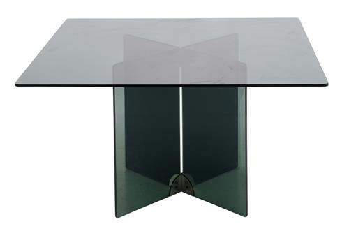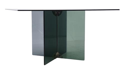 Smoked glass top on cross patterned smoked glass base with polished metal fittings.