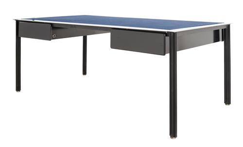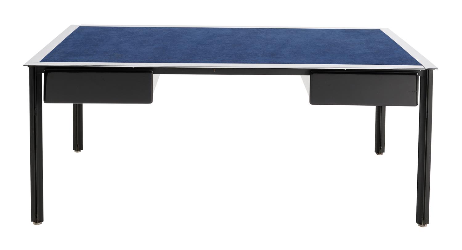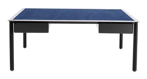 Enamelled steel frame with lacquered wooden drawers. Polished metal top with a blue felt insert.