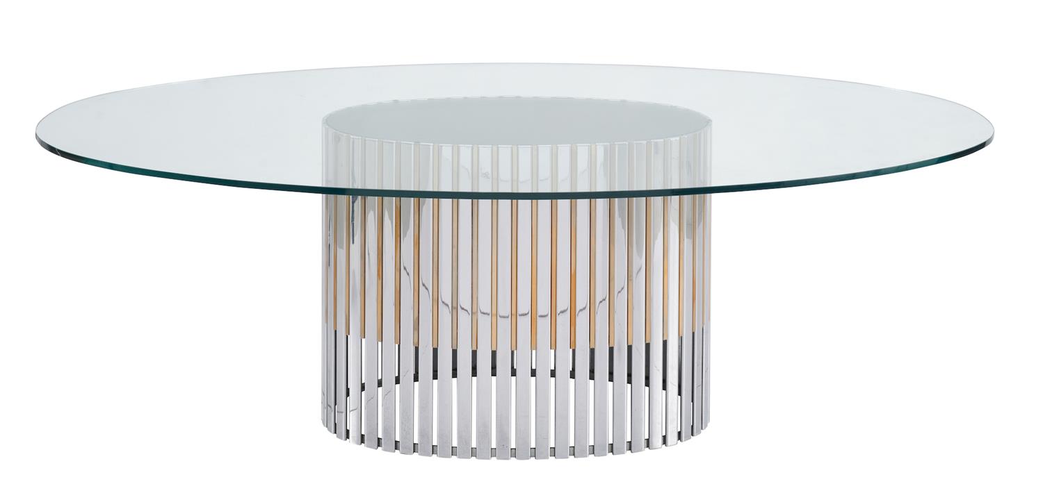 Glass top in very good condition, with minor surface marks and light scratching consistent with age and use. Missing some plastic stoppers that hold glass in place, but this does not affect structural soundness. Some tarnish to metal base and losses around the very bottom edges. Very heavy and solid.