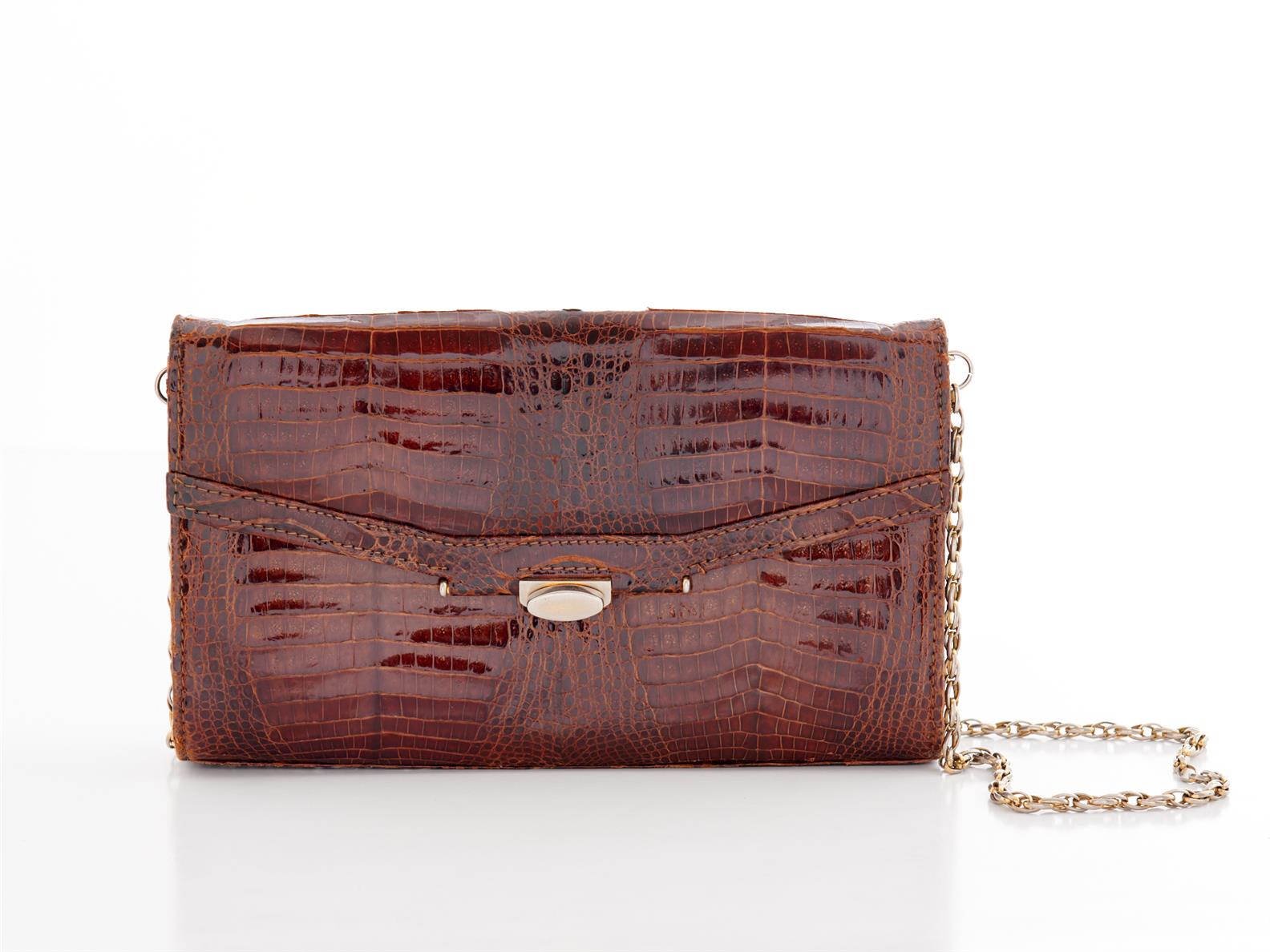 VINTAGE CROCODILE HANDBAG - Styled in brown crocodile leather with chain shoulder strap and gold tone metal hardware, 25 x 15 x 4cm.