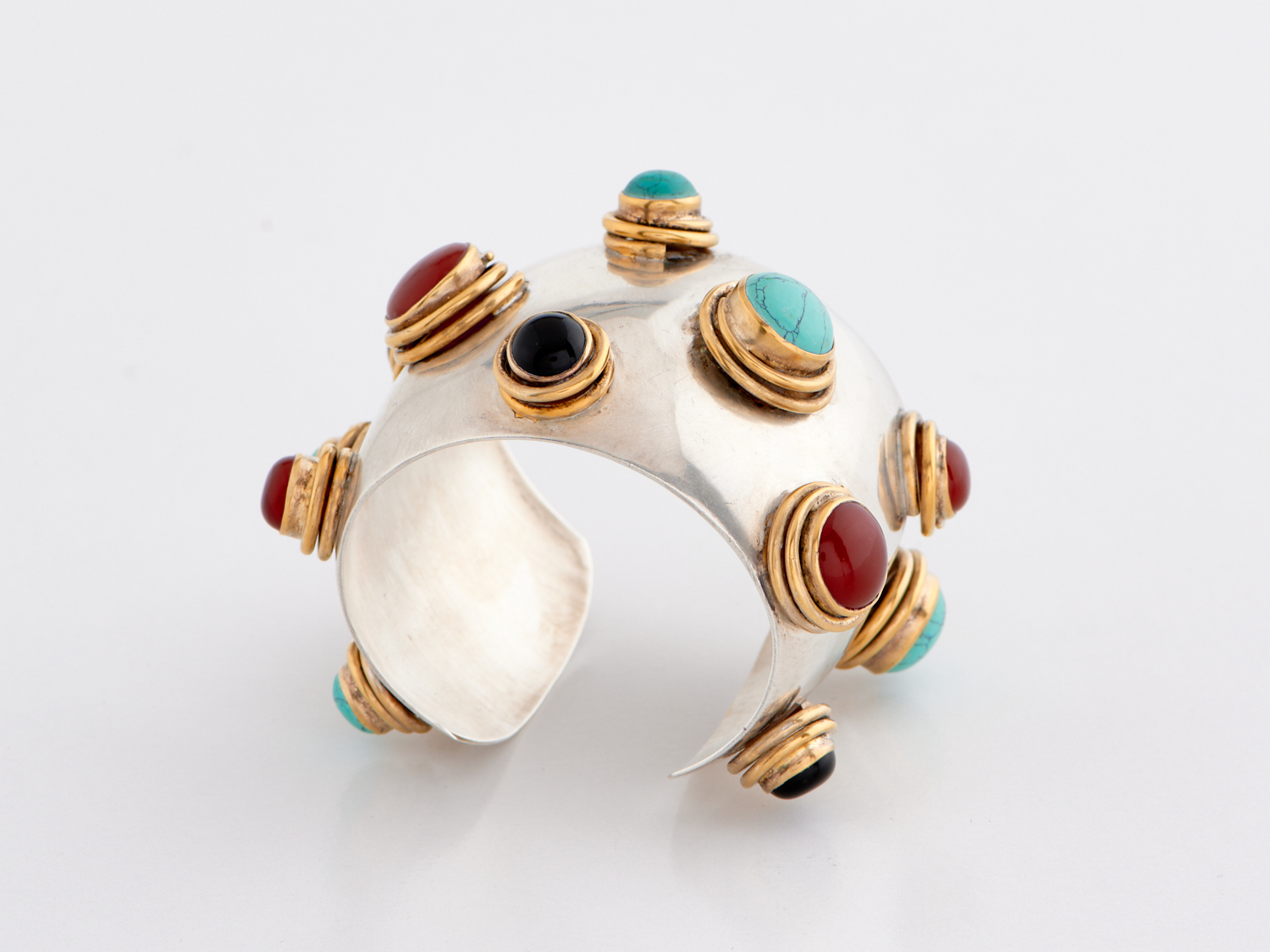 A SILVER CUFF, GEMSET WITH TURQUOISE, CARNELIAN, ONYX, WIDTH 55MM, DIAMETER 58MM