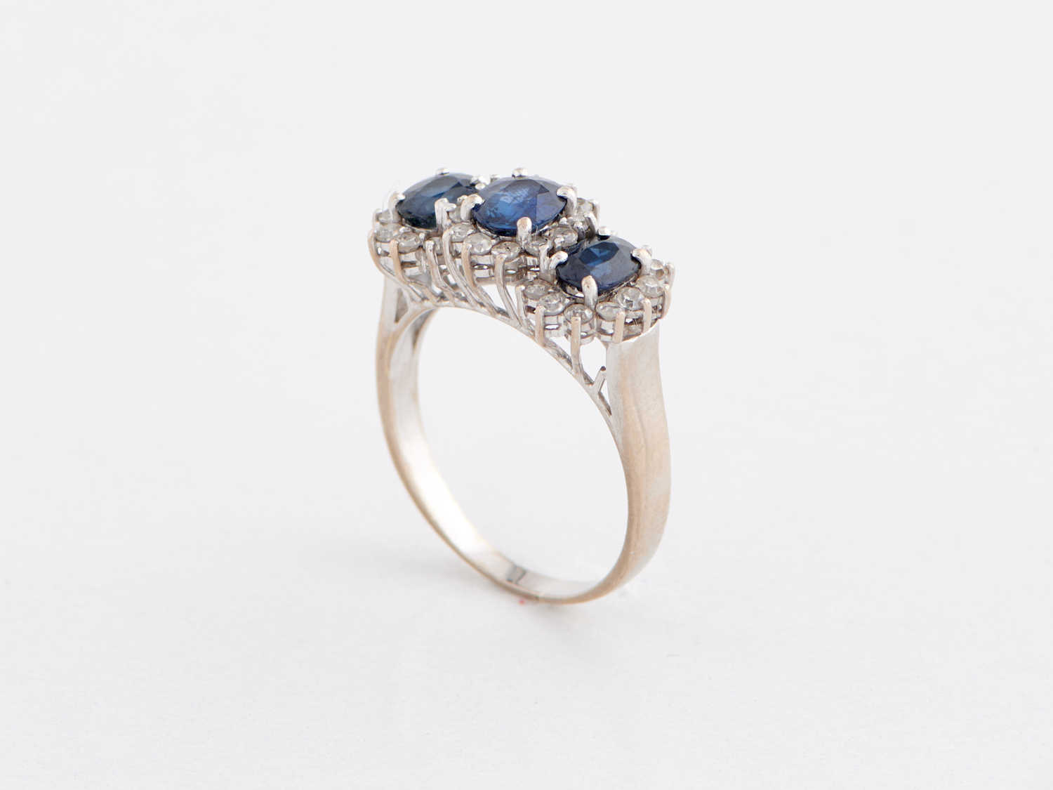 A SAPPHIRE AND DIAMOND RING IN 14CT AND PALLADIUM, THE DIAMONDS TOTALLING 0.40CTS, THE SAPPHIRES TOTALLING 1.30CTS, SIZE R, 5.4GMS