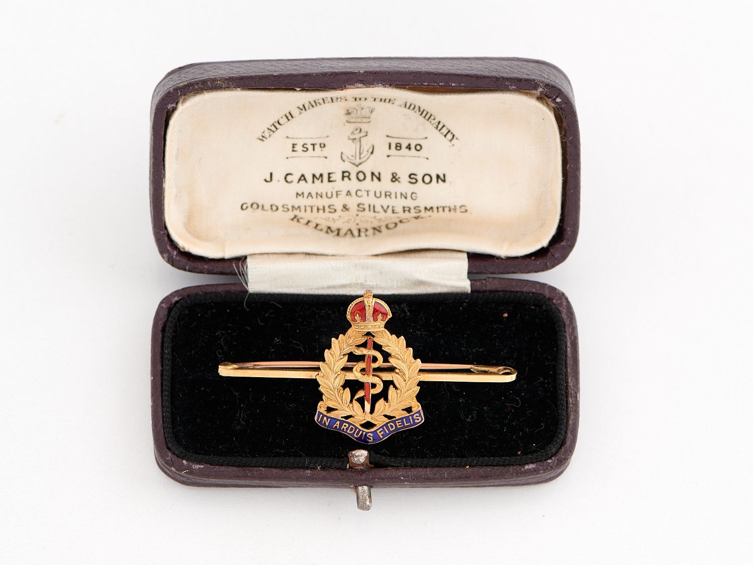A WWI ENAMEL ROYAL ARMY MEDICAL CORPS BROOCH IN 15CT GOLD, MOTTO READING 'IN ARDIUS FIDELIS', ACCOMPANIED BY A J.CAMERON & SON PERIOD BOX, LENGTH 50MM