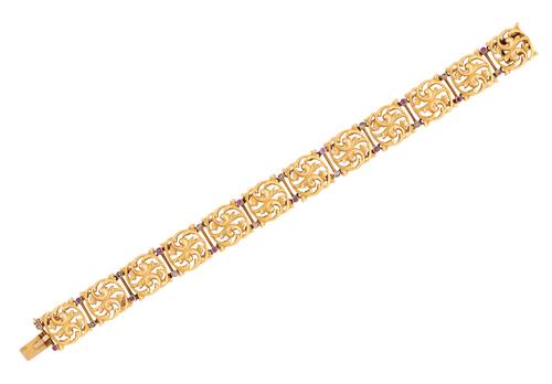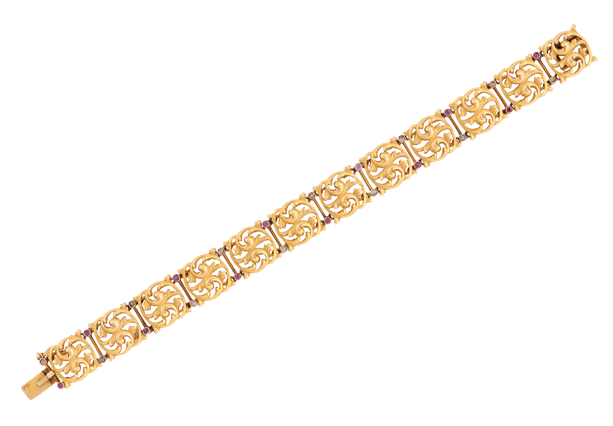 Comprising square panels of acanthus leaf design, set throughout with rubies and diamonds, completed by a concealed box clasp, length approximately 180mm.