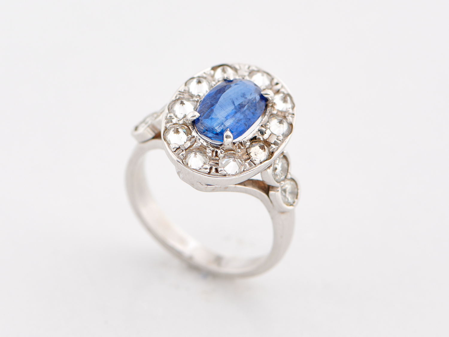 A SAPPHIRE AND DIAMOND RING IN 18CT WHITE GOLD, RING SIZE L, WEIGHT 6.3GMS