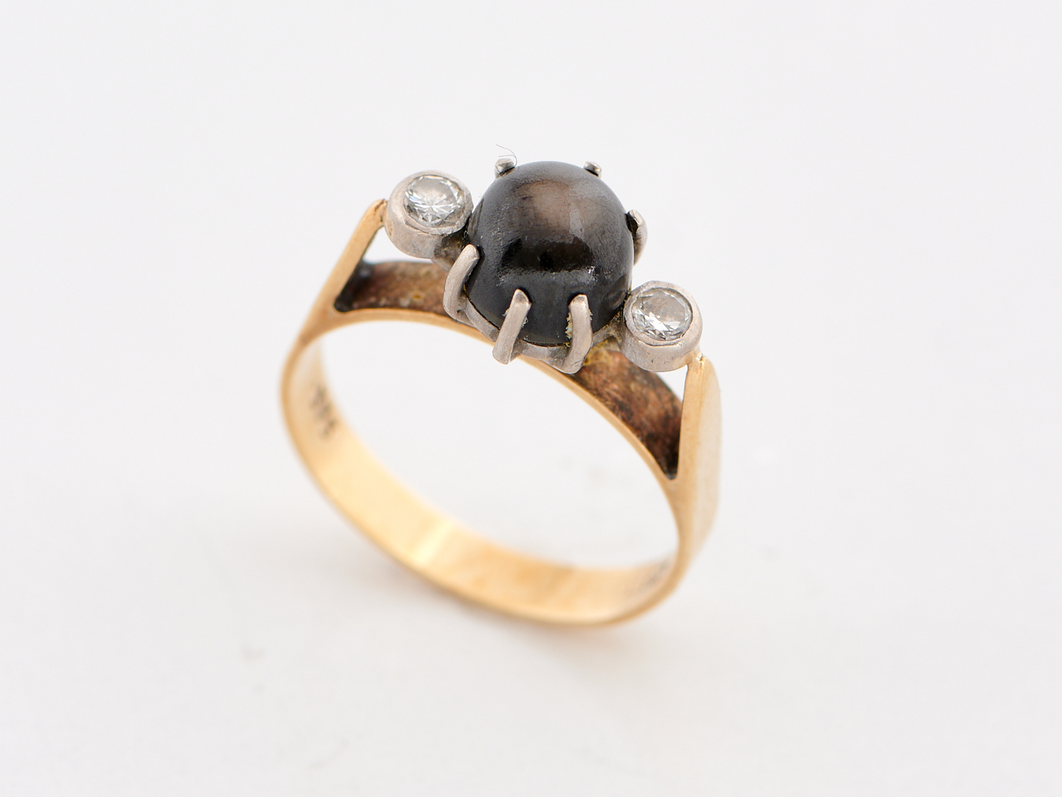 A STAR SAPPHIRE AND DIAMOND SET RING IN 9CT GOLD, RING SIZE M, WEIGHT 3.25GMS.