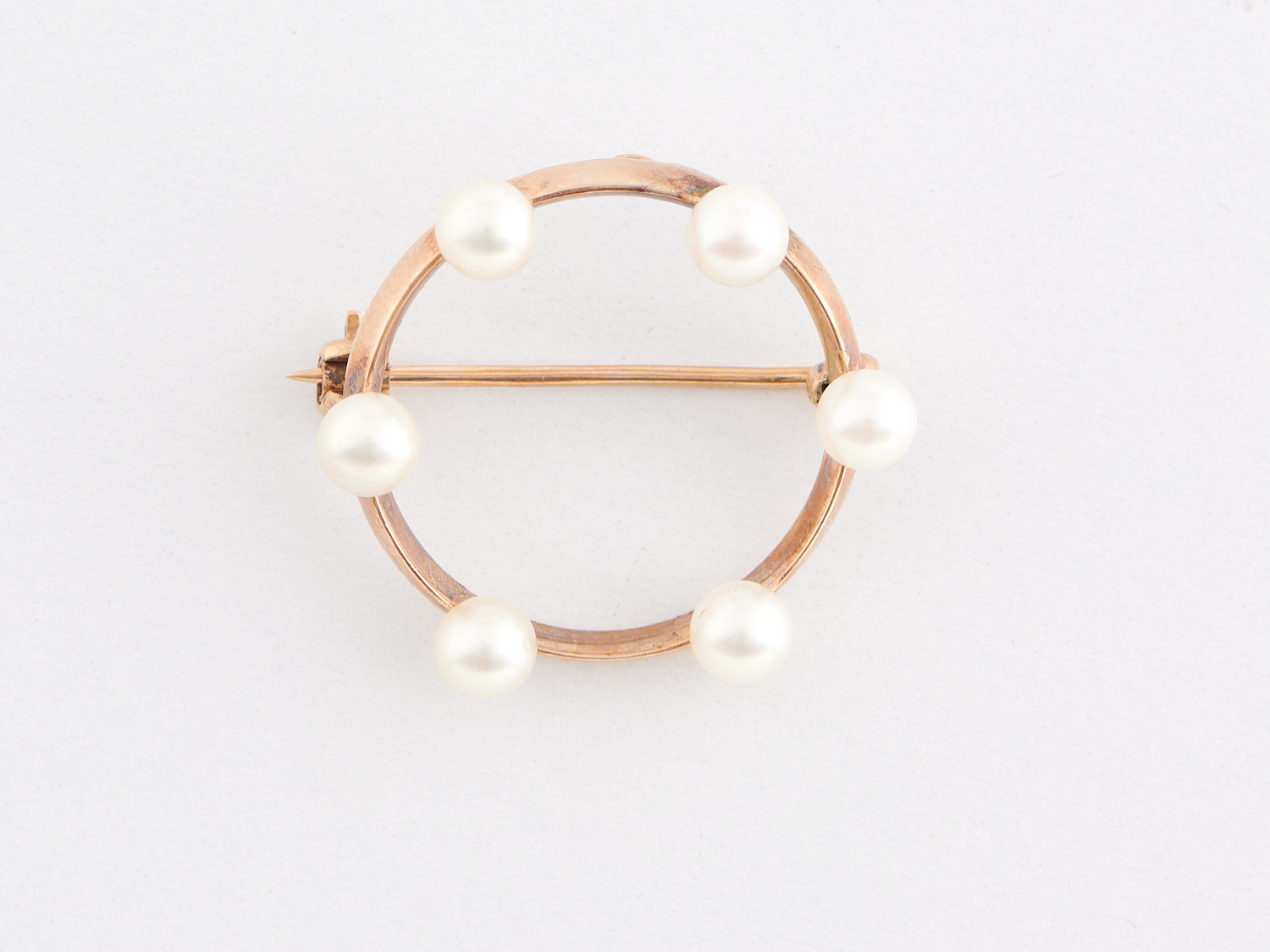A CULTURED PEARL SET BROOCH IN 9CT GOLD, DIAMETER 26MM, 3.1GMS