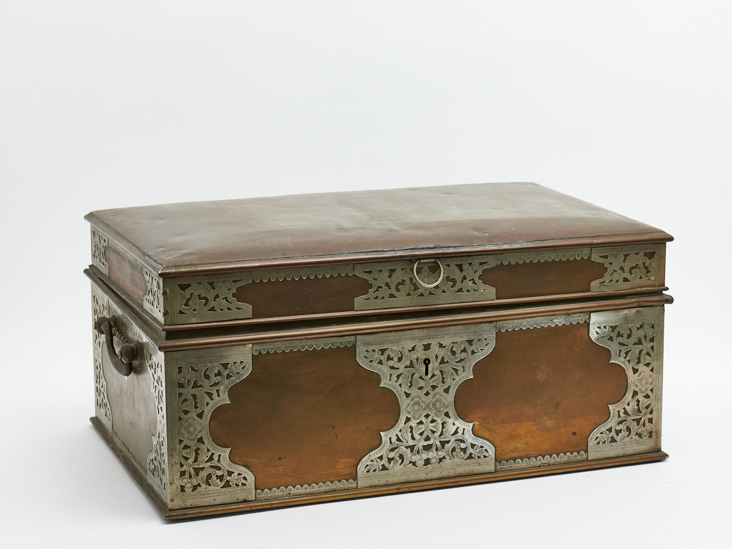 AN ENGRAVED BRASS TRUNK WITH FITTED INTERIOR (A/F) H.26CM X W.56CM, LEONARD JOEL LOCAL DELIVERY: MEDIUM