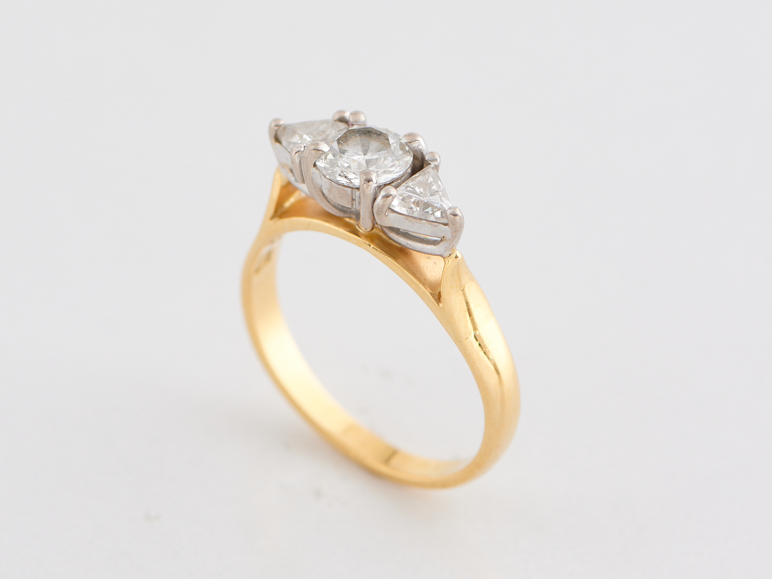 A THREE STONE DIAMOND RING IN TWO TONE 18CT GOLD, THE DIAMONDS TOTALLING APPROXIMATELY 0.8CTS (MEASURED IN SETTING), RING SIZE L, WEIGHT 3.59GMS