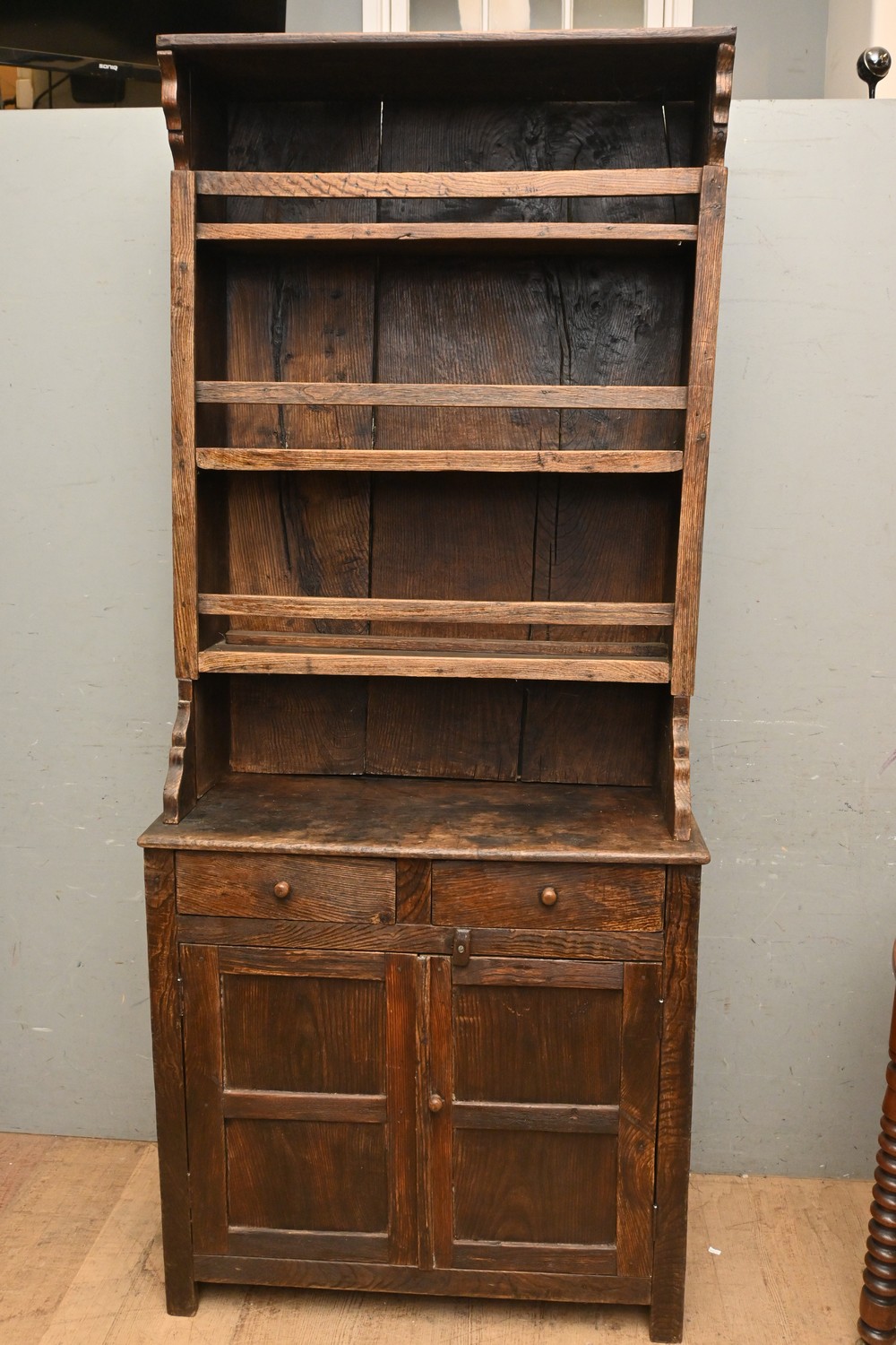 A PRIMITIVE ENGLISH OAK DRESSER (210H X 92W X 41D CM) (THIS HEAVY ITEM MUST BE REMOVED BY CLIENTS OR CARRIERS AT THE CUSTOMERS EXPENSE. LEONARD JOEL STAFF CANNOT ASSIST CARRYING THIS ITEM)