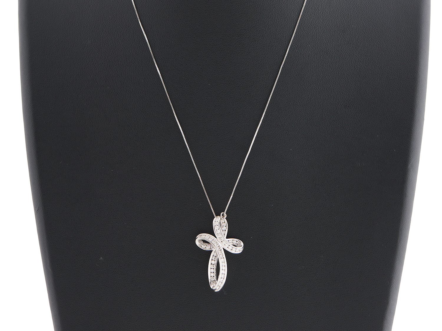 A DIAMOND PENDANT IN 18CT WHITE GOLD, APPROXIMATE SIZE 20 X 32MM, WEIGHT 3.8GMS, TO A CHAIN IN 14CT WHITE GOLD, WEIGHT 1.0GM, LENGTH 440MM