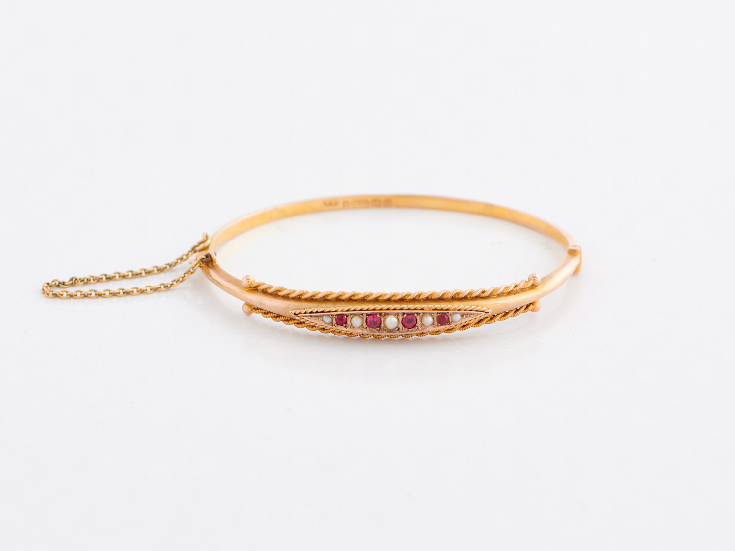 AN ANTIQUE PASTE AND SEED PEARL HINGED BANGLE IN 9CT GOLD, HALLMARKED BIRMINGHAM 1963-64, DIAMETER 57MM, 5.60 GMS
