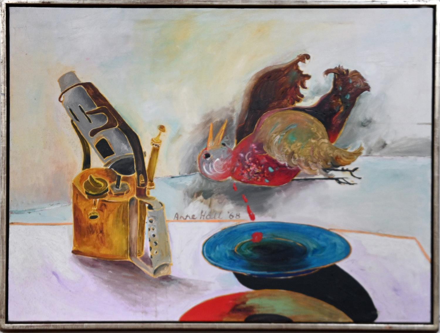 Surface dust and dirt. Staining to upper right and paint loss to lower right approx 2cm. Foreign matter dripped down the left hand side. Wear to the frame.