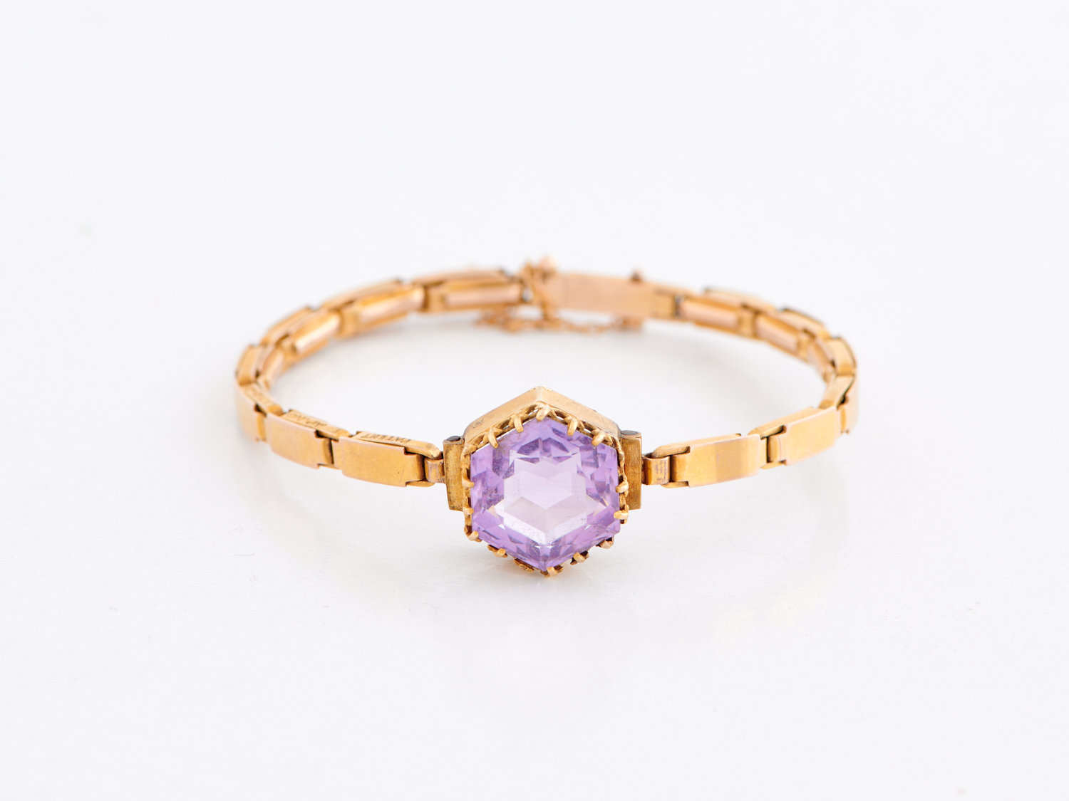 AN AMETHYST SET BRACELET IN 9CT GOLD, THE STONE DIAMETER 15MM, INNER CIRCUMFERENCE 150MM, WEIGHT 10.92 GMS