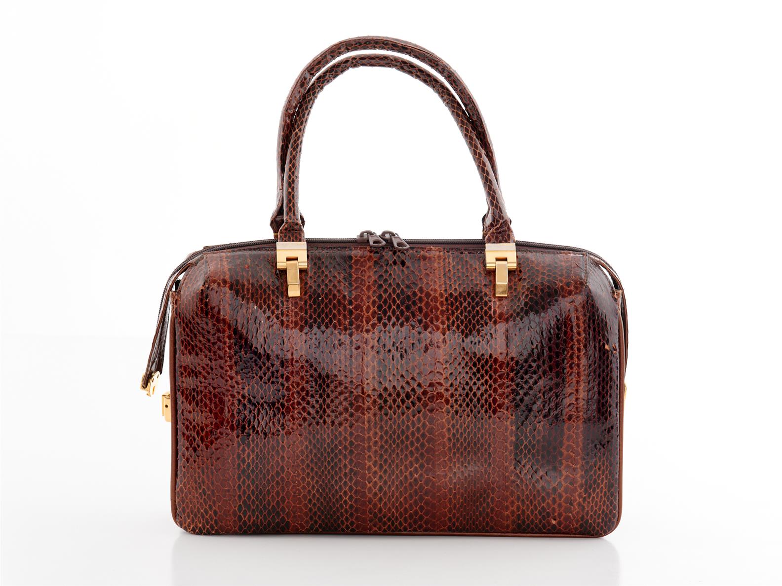 VINTAGE HANDBAG - Styled in brown snakeskin, with dual rolled handles and zip closure, 22 x 30 x 7cm.