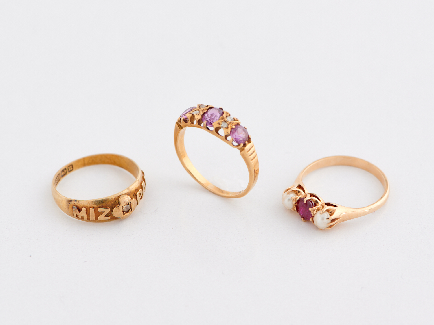 AN ANTIQUE DIAMOND 'MIZPAH' RING IN 15CT GOLD, BIRMINGHAM HALLAMRKS 1894-95, RING SIZE M/N, WEIGHT 3.1GMS, TOGETHER WITH AN ANTIQUE RUBY AND SEED PEARL RING IN 9CT GOLD AND AN AMETHYST AND SEED PEARL RING IN 9CT GOLD, RING SIZES M AND N (WEIGHT 5.6GMS)