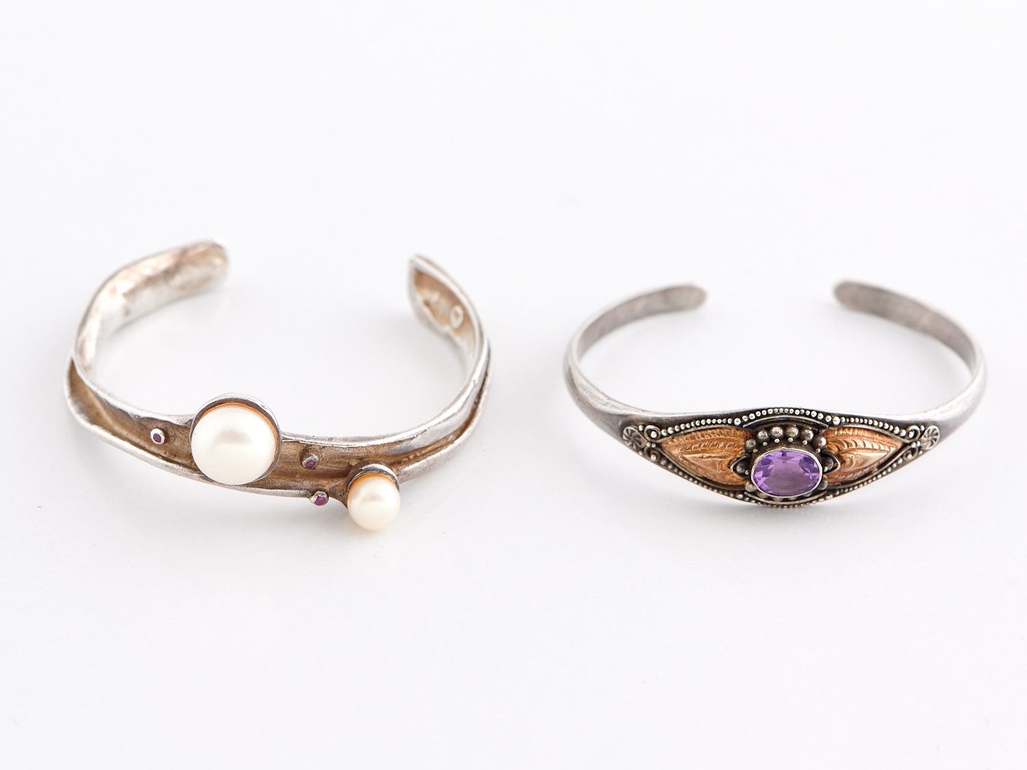 TWO PEARL AND GEM SET SILVER CUFF BANGLES, ONE WITH GOLD INLAY, TOTAL WEIGHT 43.9GMS