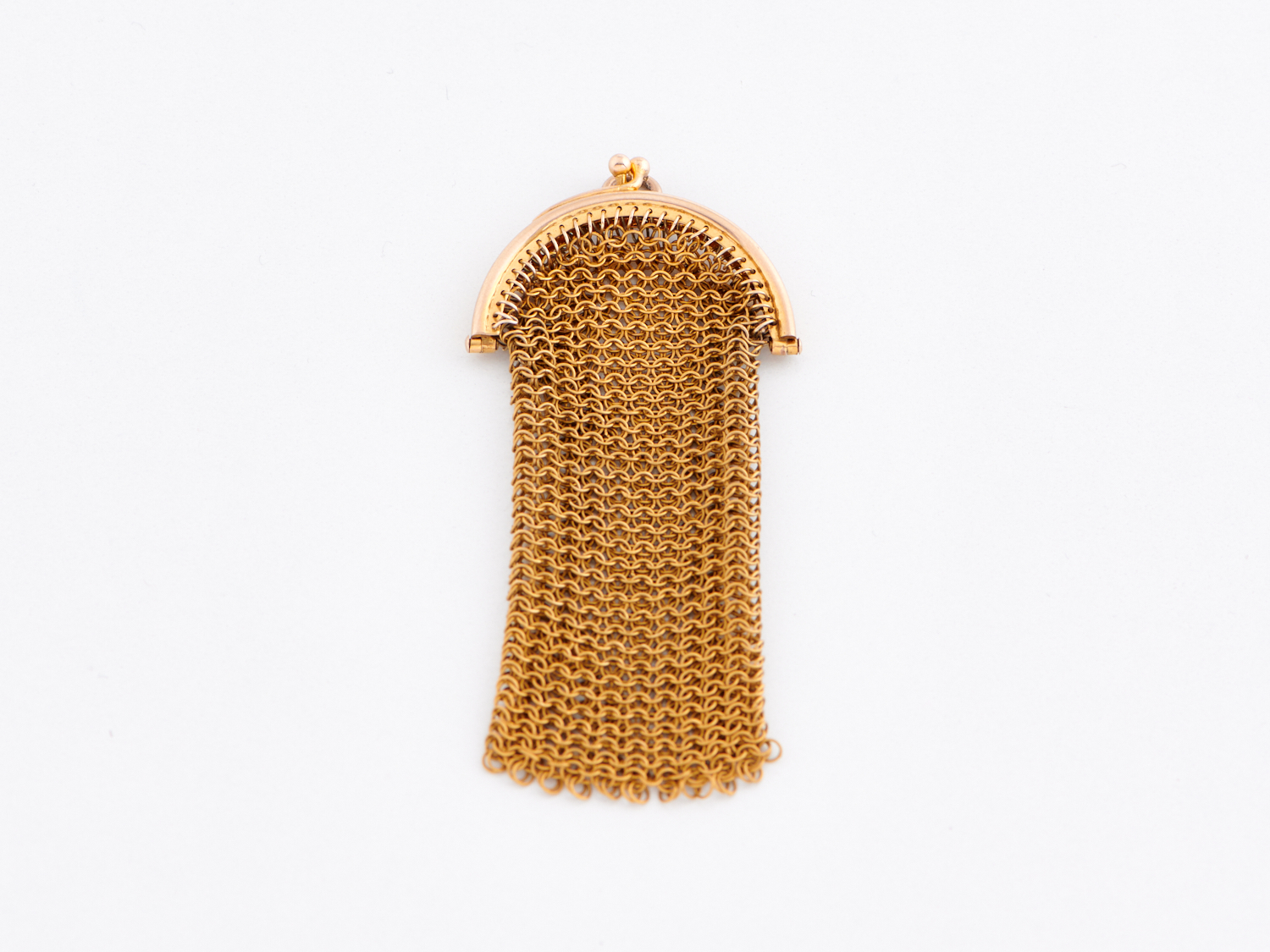 AN ANTIQUE COIN PURSE PENDANT IN 9CT GOLD, 79MM X 35MM, WEIGHT 14.8 GMS
