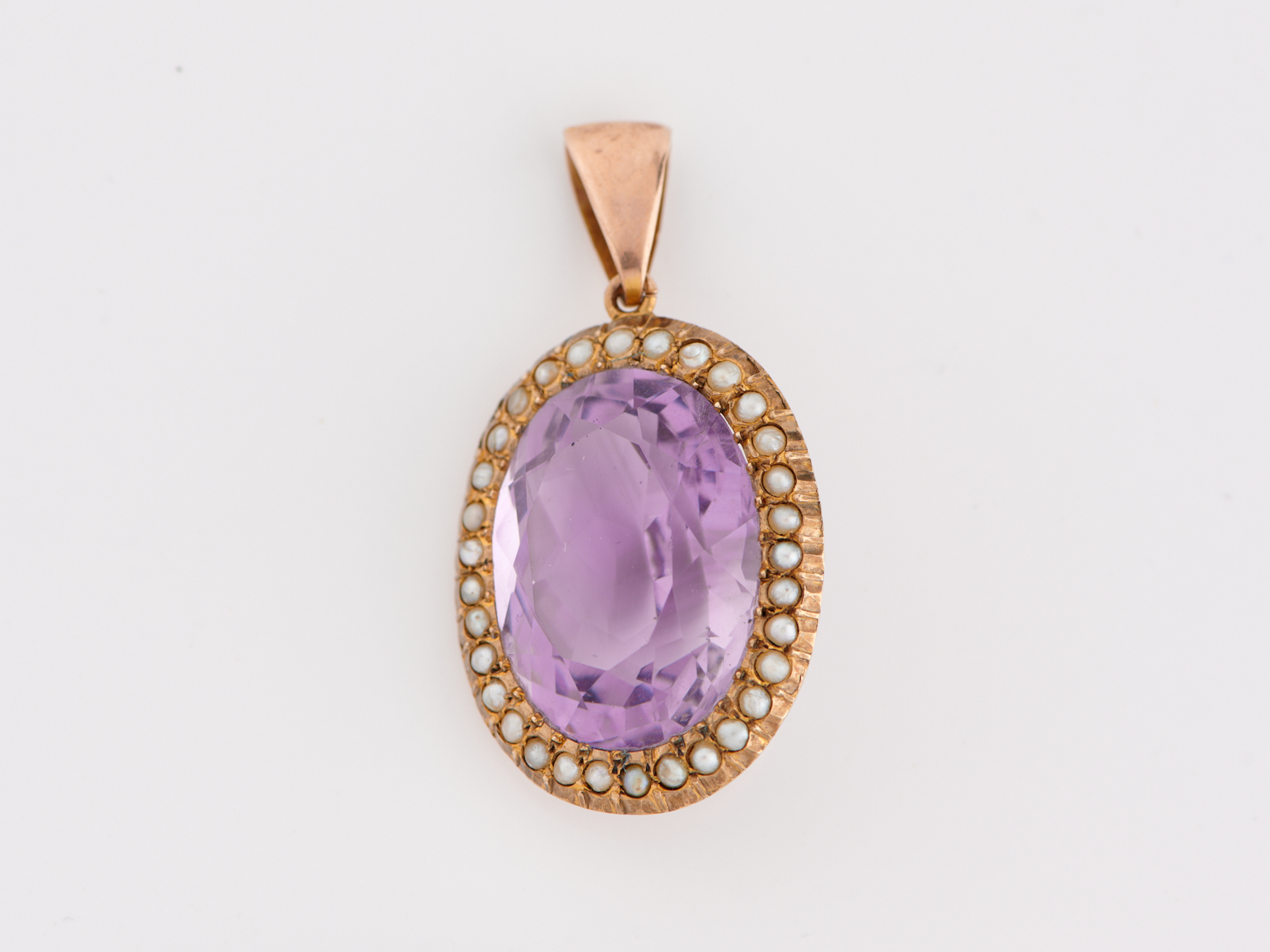 AN ANTIQUE AMETHYST AND SEED PEARL PENDANT IN 9CT ROSE GOLD, 21MM X 27MM, 5.5 GMS
