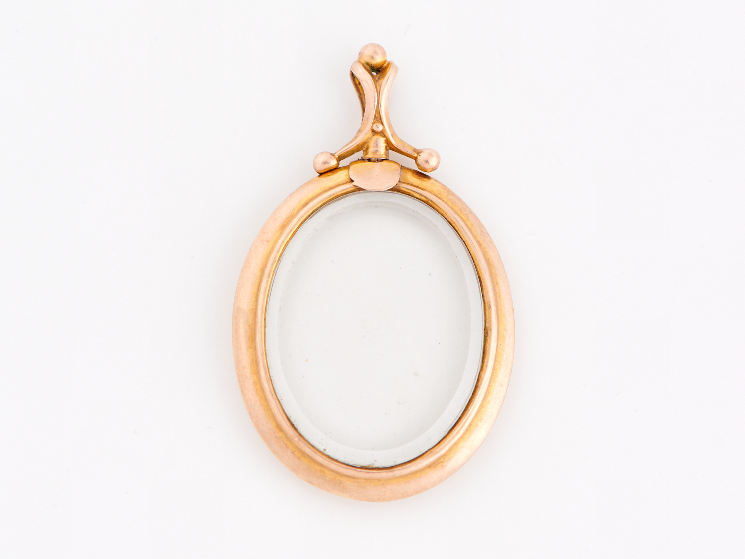 A LOCKET IN 9CT GOLD, LENGTH 47MM, 35 x 28MM WITHOUT BAIL, WEIGHT 9.00GMS (INCLUDING GLASS INSERT)