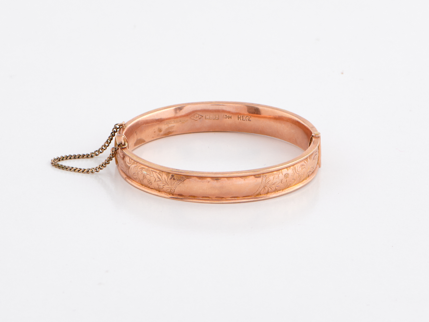 AN ANTIQUE ENGRAVED WAX FILLED HINGED BANGLE IN 9CT ROSE GOLD, DIAMETER 57MM, WEIGHT 14.5GMS