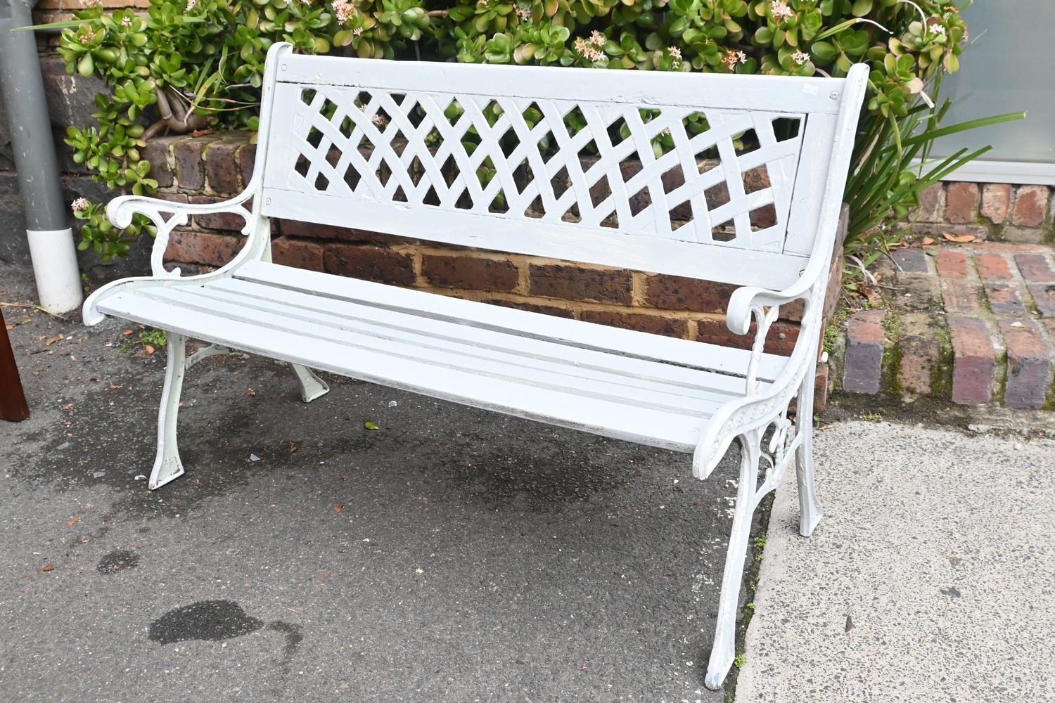 A PAINTED OUTDOOR BENCH (A/F) (H73 X W112 X D49 CM) (LEONARD JOEL DELIVERY SIZE: X-LARGE)