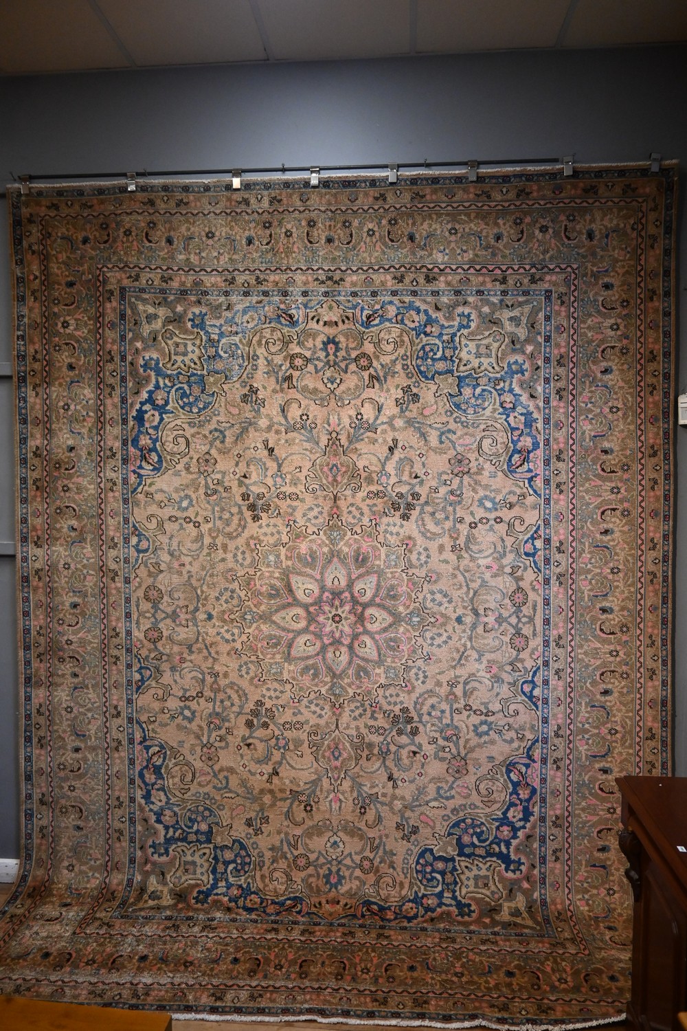 A DECORATIVE CONTEMPORARY VINTAGE OVER-DYED PERSIAN TABRIZ RUG. CENTRAL FLORAL ELONGATED MEDALLION WITH AN ALL-OVER DESIGN OF PALMETTES AND FLORAL SPRAYS. THE SHORN PILE IS OVER-DYED IN BEAUTIFUL COLOURS OF CHOCOLATE BROWN, CORAL, BLUE, ON A TAN TONE BASE. THIS RUG IS IDEAL FOR ALL TYPES OF HOME DÉCOR AND CAN BE STYLED TO COMPLEMENT ALL SURROUNDINGS. EX-GALLERY EXHIBITED. SIZE: 379 X 286 CM ORIGIN: PERSIA - RRP: $7,900 DOCUMENTATION OF AUTHENTICITY INCLUDED.
