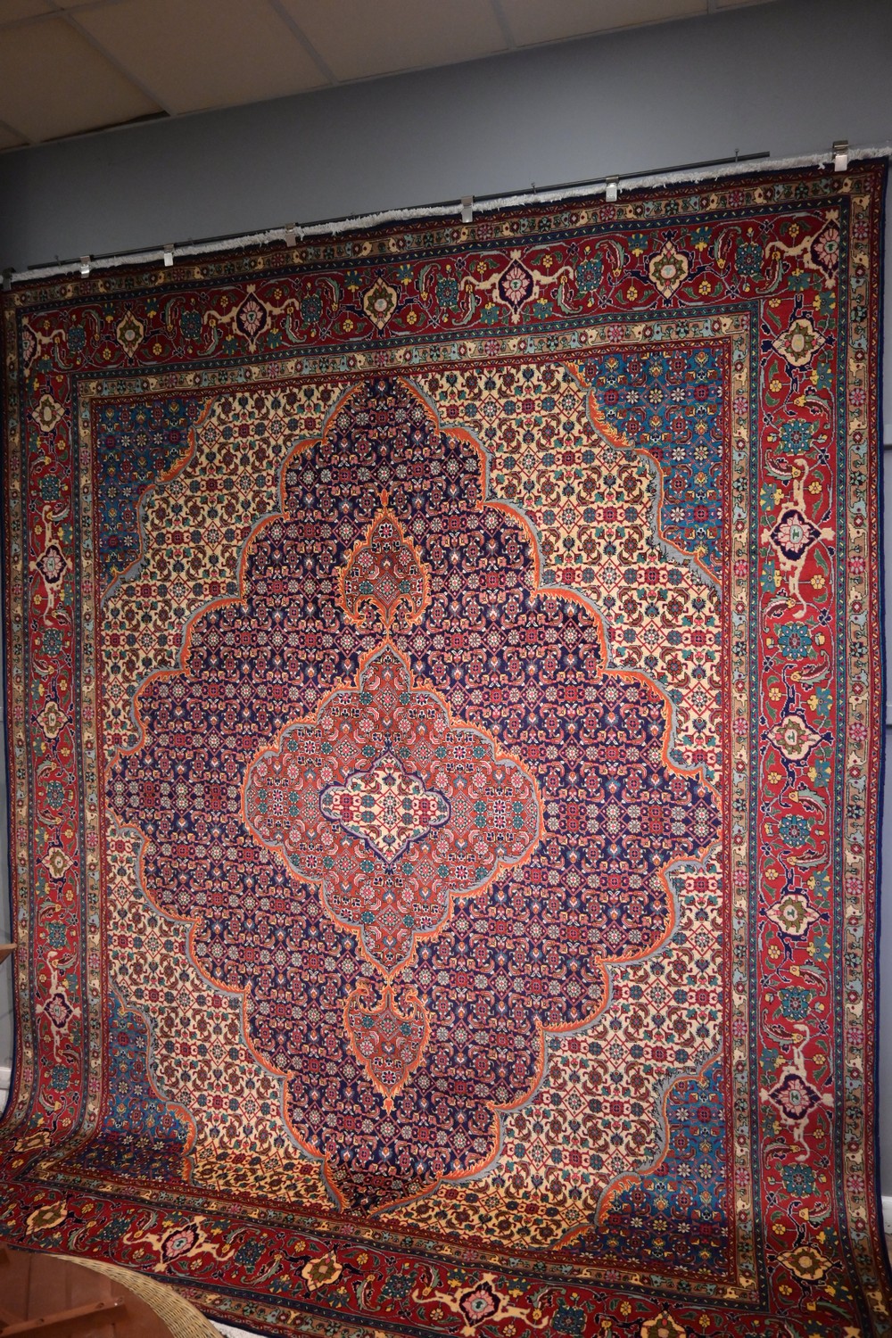 A MAGNIFICENT EXTREMELY SOLID PERSIAN TABRIZ AZARSHAHR CARPET. 100% DENSE WOOL PILE. IN EXCELLENT CONDITION. CLASSIC TABRIZ DESIGN OF BOLD ANCHORED-CHANDELIER FLORAL MEDALLION ON AN ALL-OVER FIELD OF HERATI MOTIFS. IN COLOURFUL TONES OF BURNT ORANGE, RUST, TEAL, AND NAVY BLUE. MAJOR BORDER OF FLORAL SPRAYS, TENDRILS & PALMETTES IN A ROYAL RED FIELD. CORNER MEDALLIONS IN CREAM WITH HERATI MOTIFS. SIZE: 390 X 300 CM ORIGIN: PERSIA - RRP: $7,900 DOCUMENTATION OF AUTHENTICITY INCLUDED.