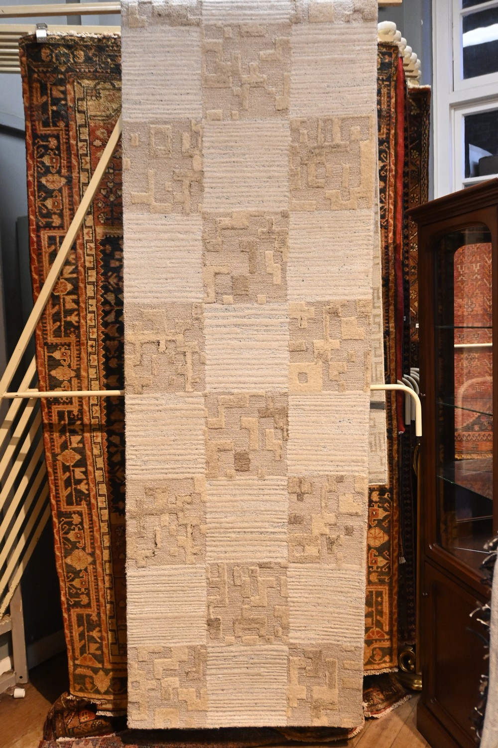 A NEW MODERN HAND TUFTED RUNNER. 100% WOOL & VISCOSE. IN TONES OF BEIGE AND IVORY. (80CM X 402CM)