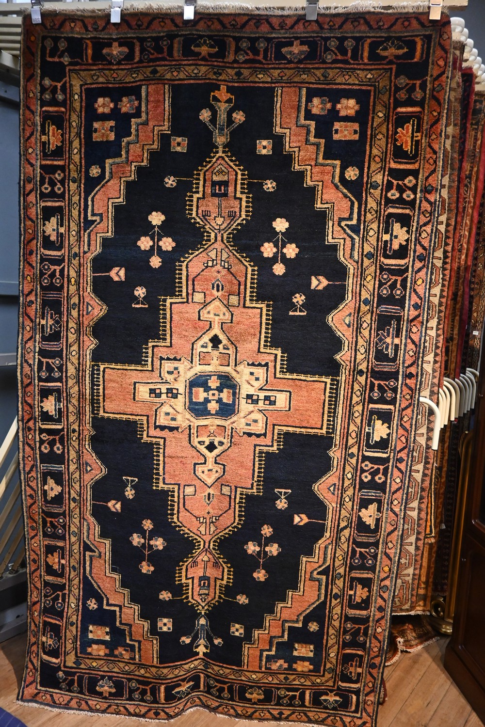 A FABULOUS PERSIAN NAHAVAND RUG. 100% WOOL. NATURAL DYES. HAND-KNOTTED VILLAGE WEAVE WITH A UNIQUE DESIGN STYLIZED ELONGATED MEDALLION IN A RUST TONE, SET WITHIN A RICH NAVY FIELD OF VARYING TRIBAL FLORAL PATTERNS & TREE OF LIFE DESIGN & ANIMAL MOTIFS. BORDER OF FLORAL AND GEOMETRIC DESIGNS. SIZE: 250 X 143 CM ORIGIN: PERSIA - RRP: $2,600 DOCUMENTATION OF AUTHENTICITY INCLUDED