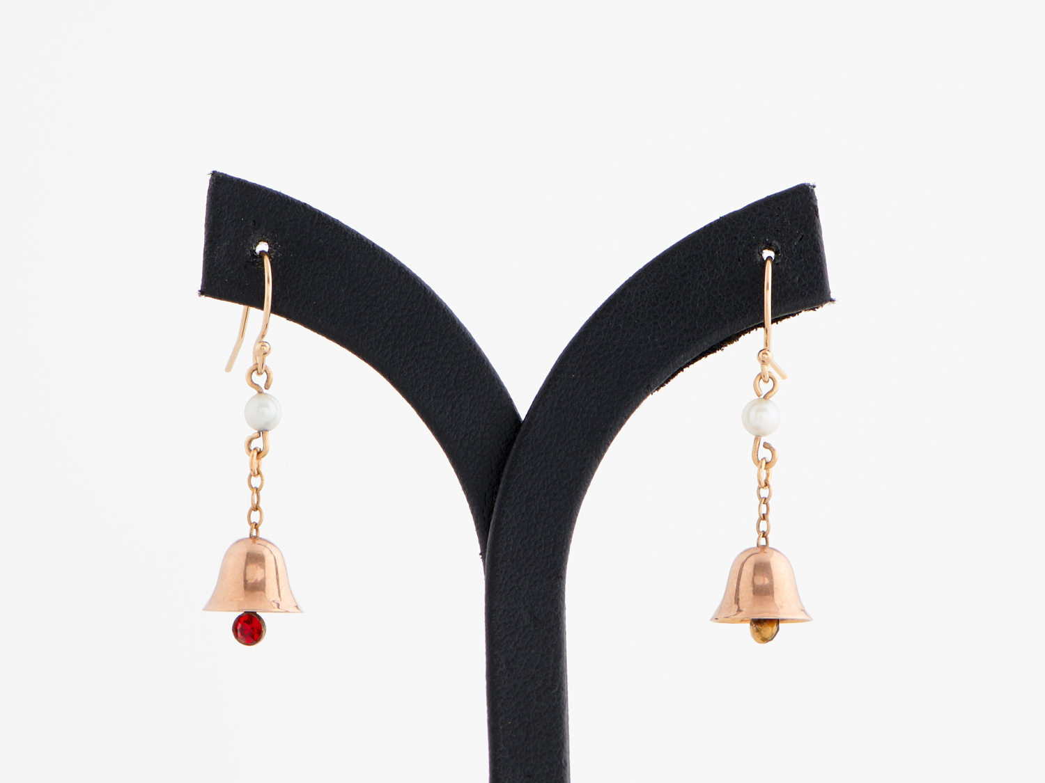 A PAIR OF VINTAGE 9CT GOLD BELL FORM EARRINGS WITH CULTURED PEARL DETAIL AND RED PASTE STONES, LENGTH 35MM, WEIGHT 1.7GMS.