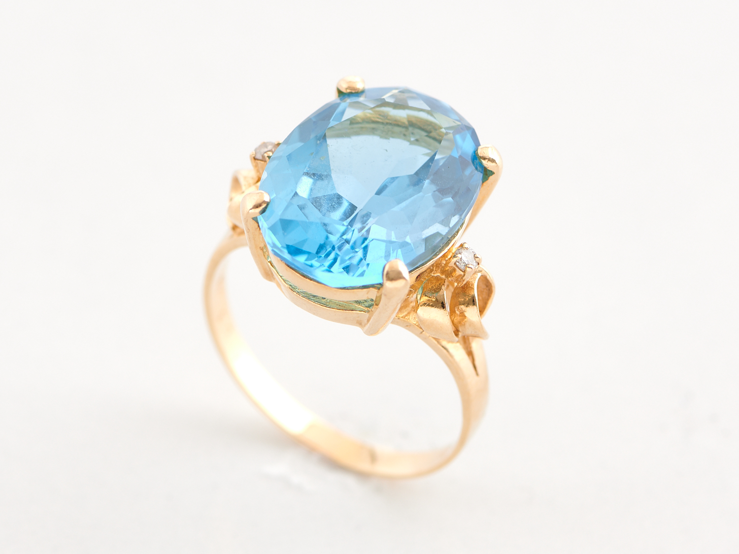 A TOPAZ AND DIAMOND SET RING IN 14CT GOLD, THE TOPAZ MEASURING 15.9 X 12.1MM, RING SIZE R, WEIGHT 6.0GMS