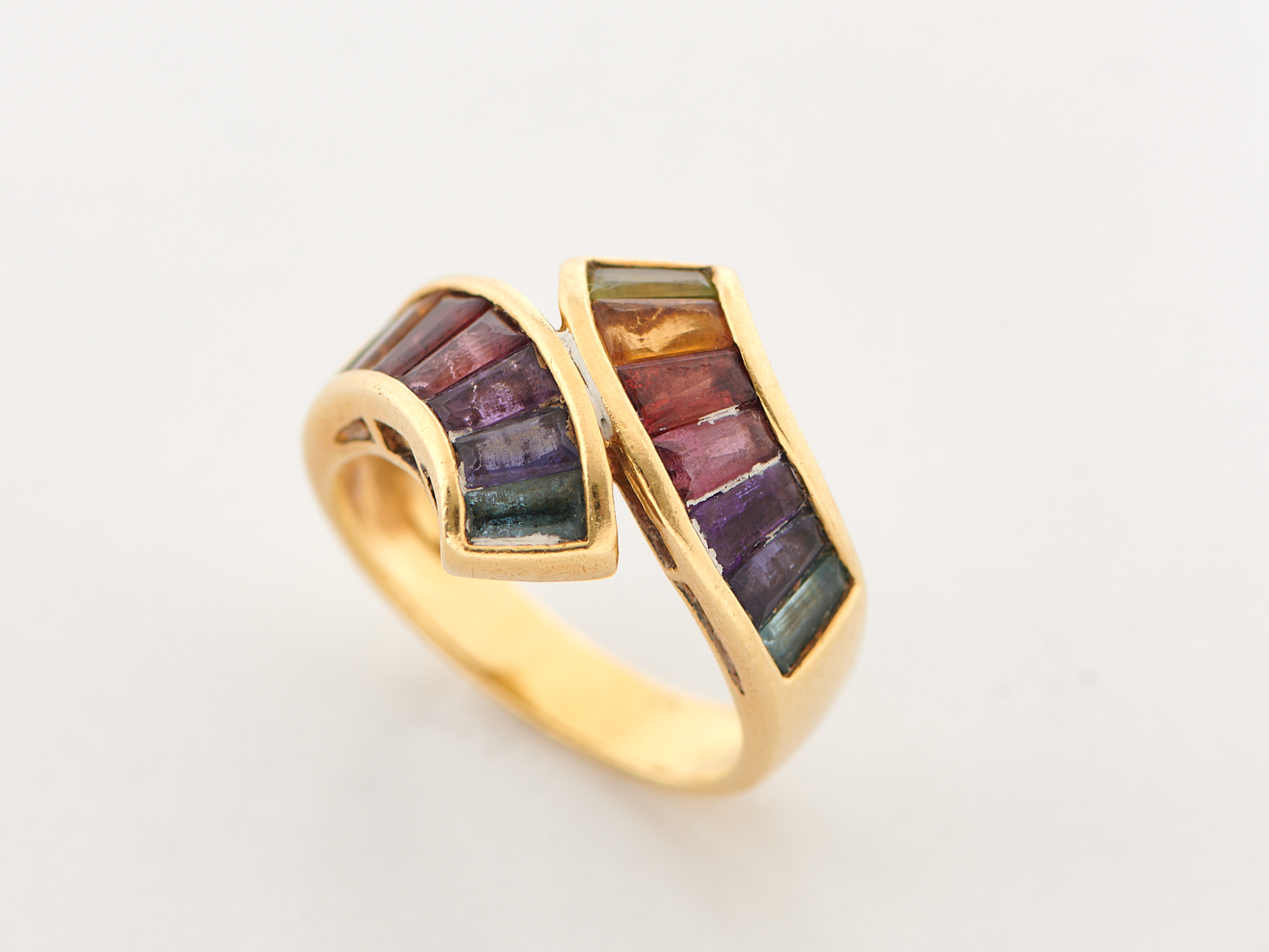 AN AMETHYST, PERIDOT, TOURMALINE AND CITRINE SET RING IN 18CT GOLD, RING SIZE P-Q, WEIGHT 7.4GMS
