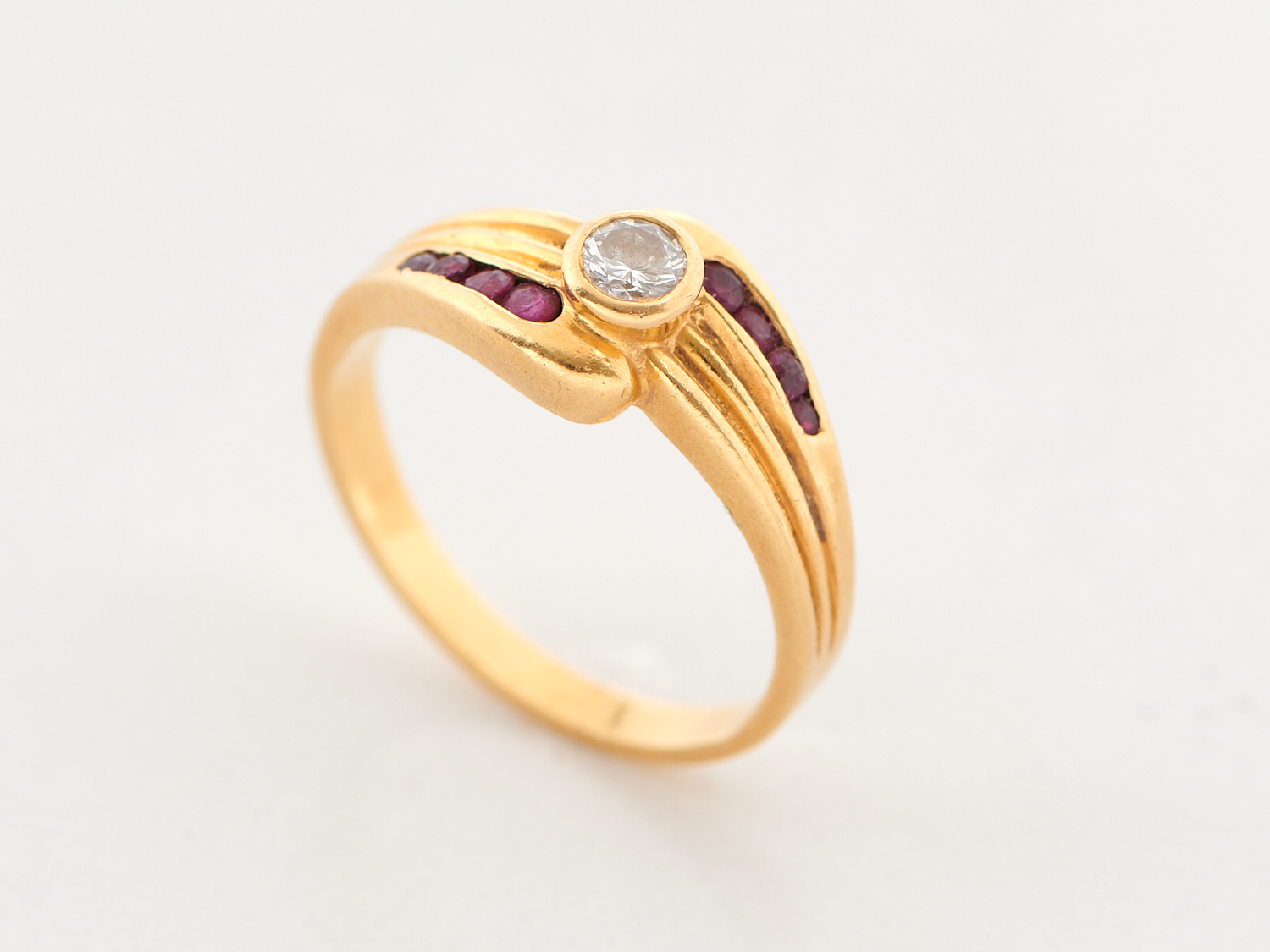 A RUBY AND DIAMOND SET RING IN 18CT GOLD, RING SIZE O, WEIGHT 5.1GMS