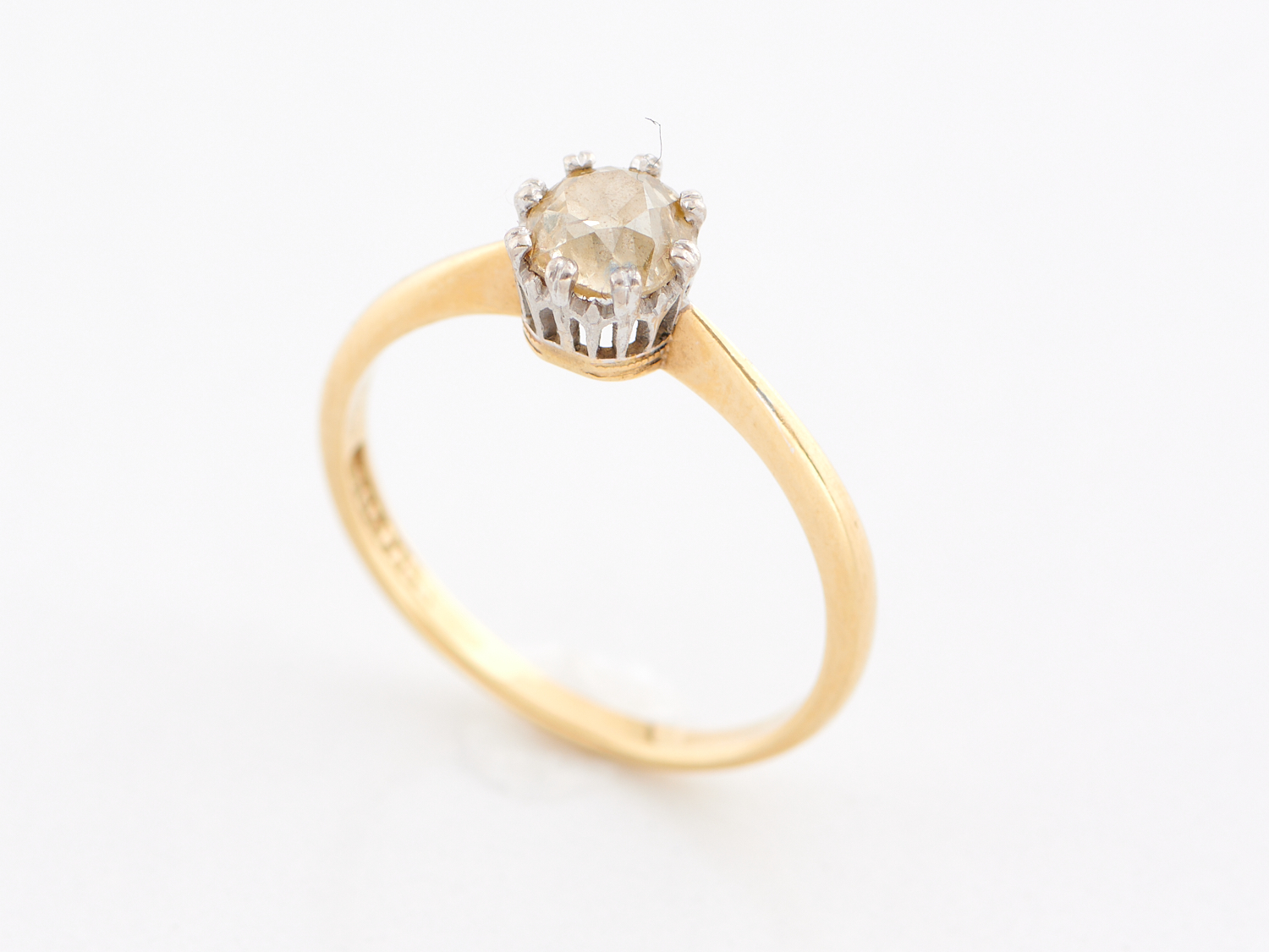 A DIAMOND RING IN 18CT GOLD, THE OLD CUT CAPE DIAMOND WEIGHING APPROXIMATELY 0.67CTS, SIZE O, 2.3GMS