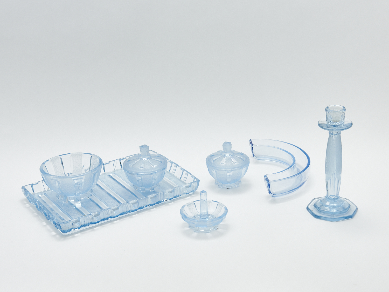 AN ART DECO SEVEN PIECE BLUE PRESSED GLASS DRESSING TABLE SET, L.31CM (LARGEST), LEONARD JOEL LOCAL DELIVERY: SMALL
