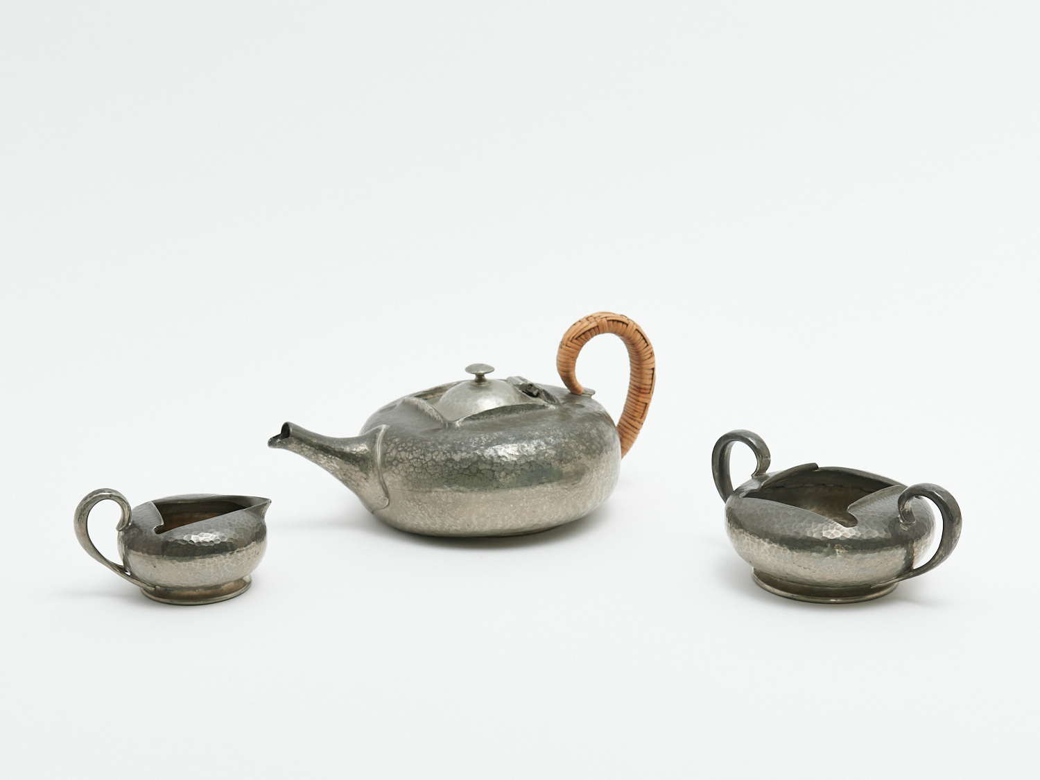 AN ENGLISH THREE PIECE PEWTER TEA SET (A/F), LEONARD JOEL LOCAL DELIVERY: SMALL