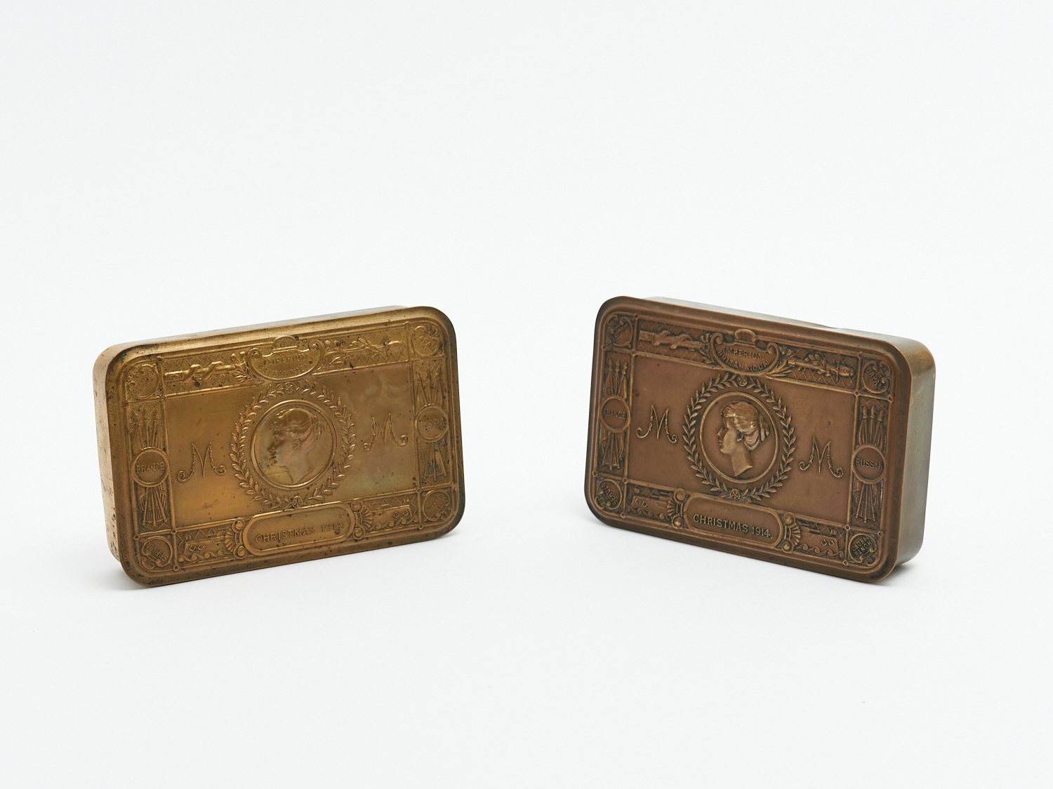 TWO 1914 FIRST WORLD WAR BRASS PRESSED TINS, W.13CM, LEONARD JOEL LOCAL DELIVERY: SMALL