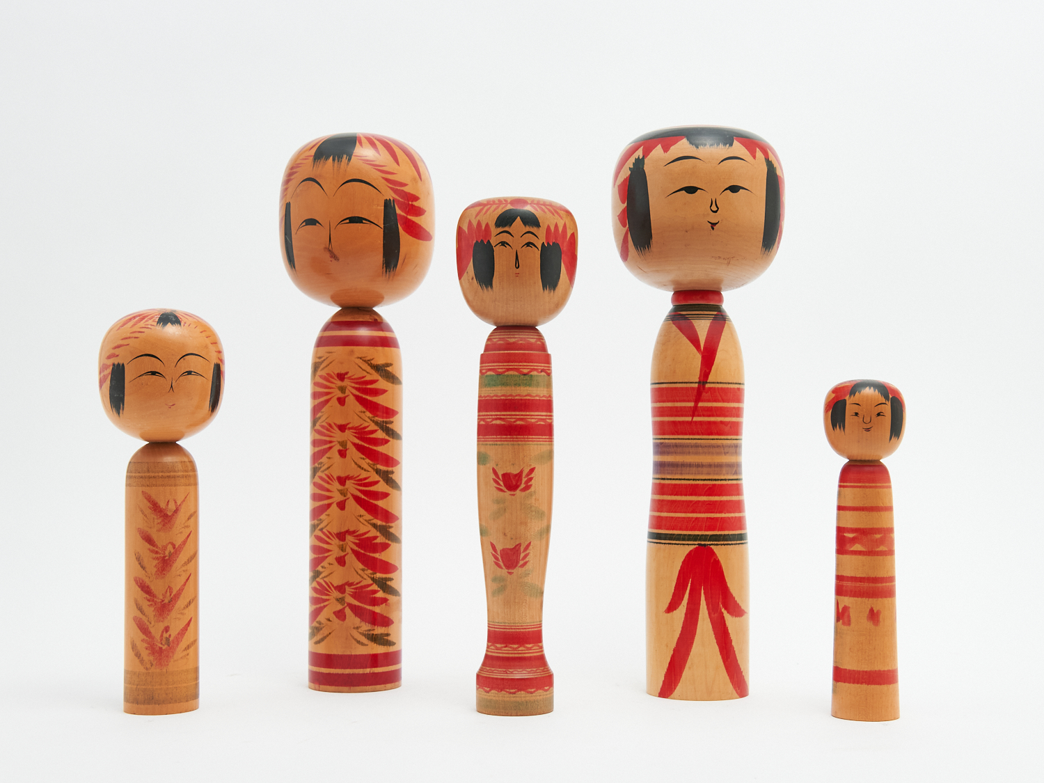 FIVE VINTAGE HANDPAINTED WOODEN JAPANESE KOKESHI DOLLS H.35.5CM (TALLEST), LEONARD JOEL LOCAL DELIVERY: MEDIUM