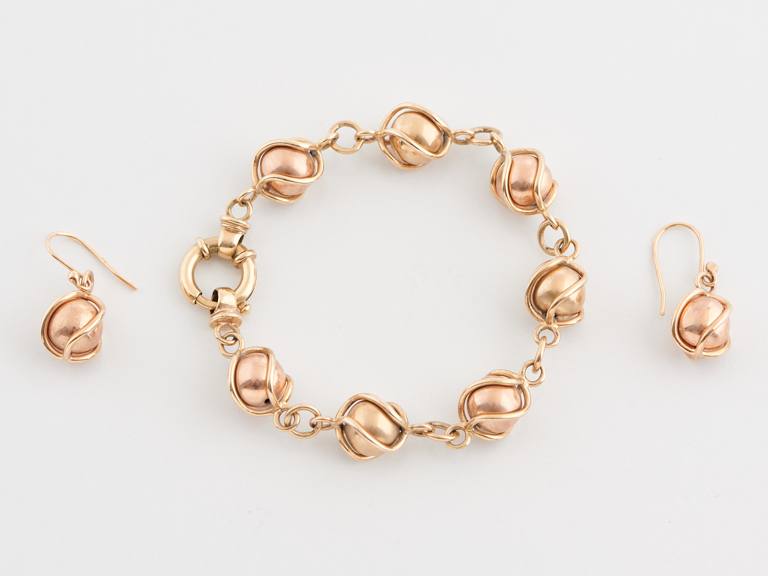 A BALL BRACELET AND EARRING SUITE IN 9CT GOLD, TOTAL WEIGHT 42.7GMS
