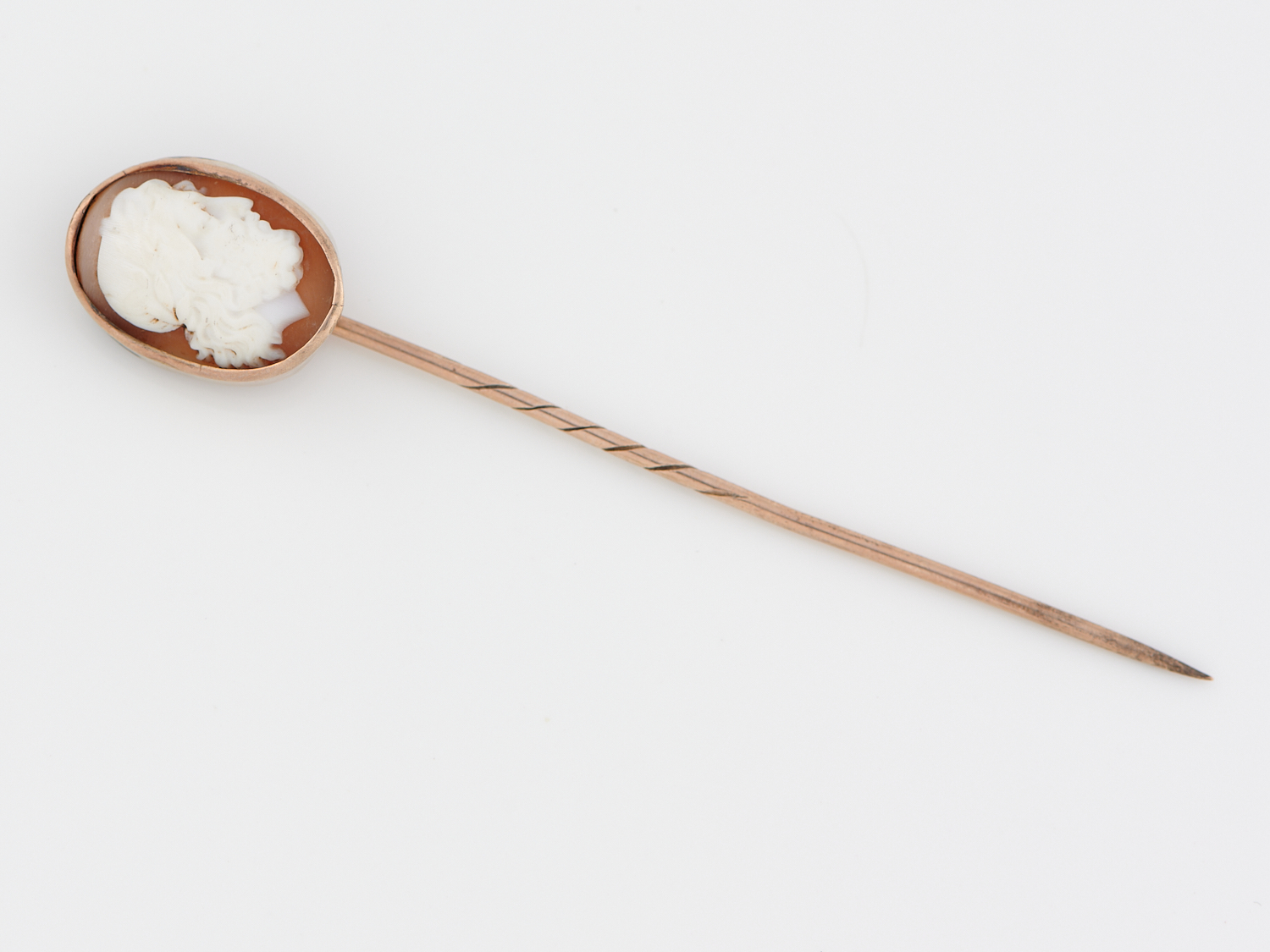 A CAMEO STICK PIN IN GOLD PLATE, LENGTH 69MM