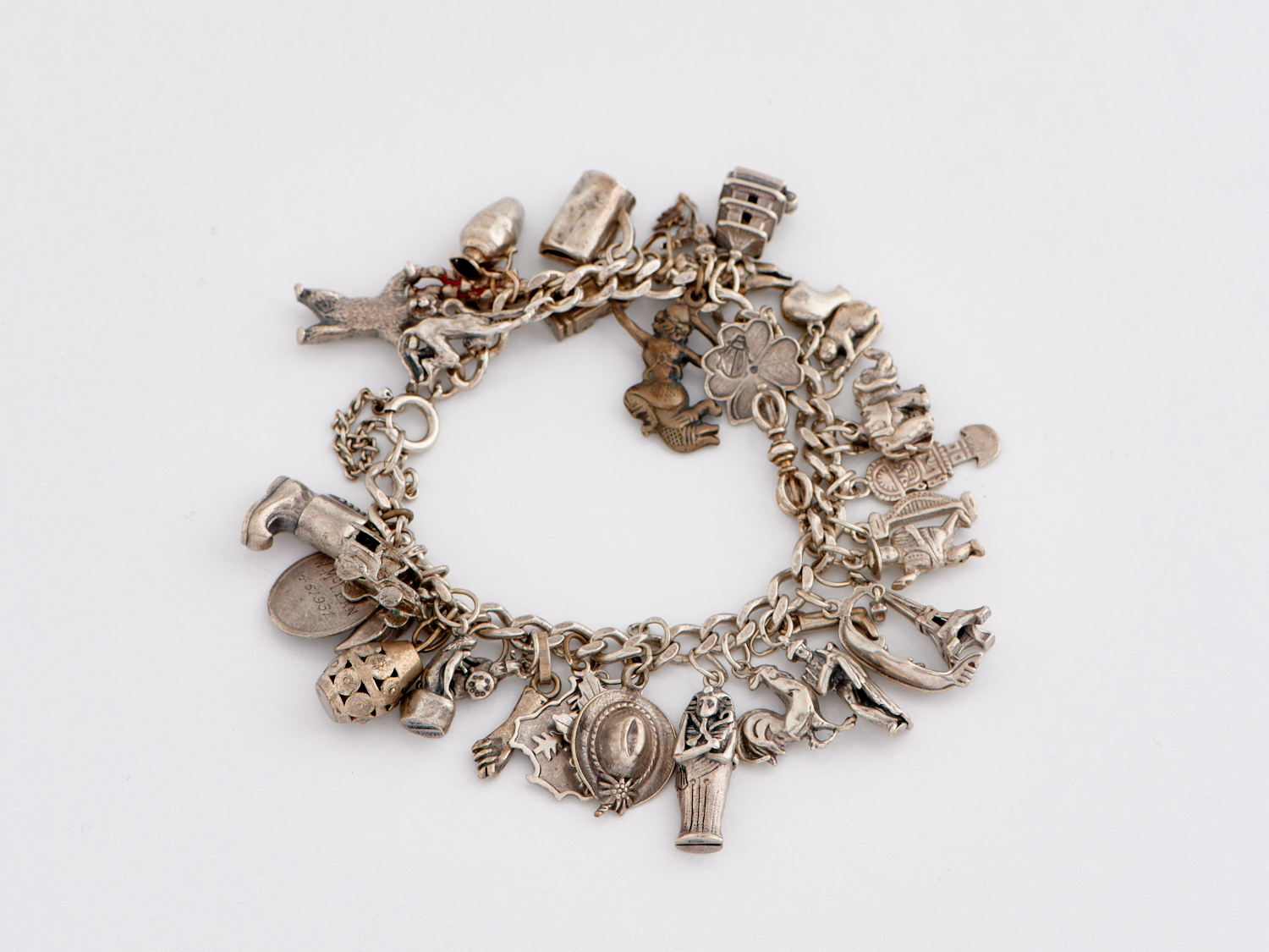 A CHARM BRACELET IN STERLING SILVER, TOTAL LENGTH APPROXIMATELY 190MM, WEIGHT 93.2GMS
