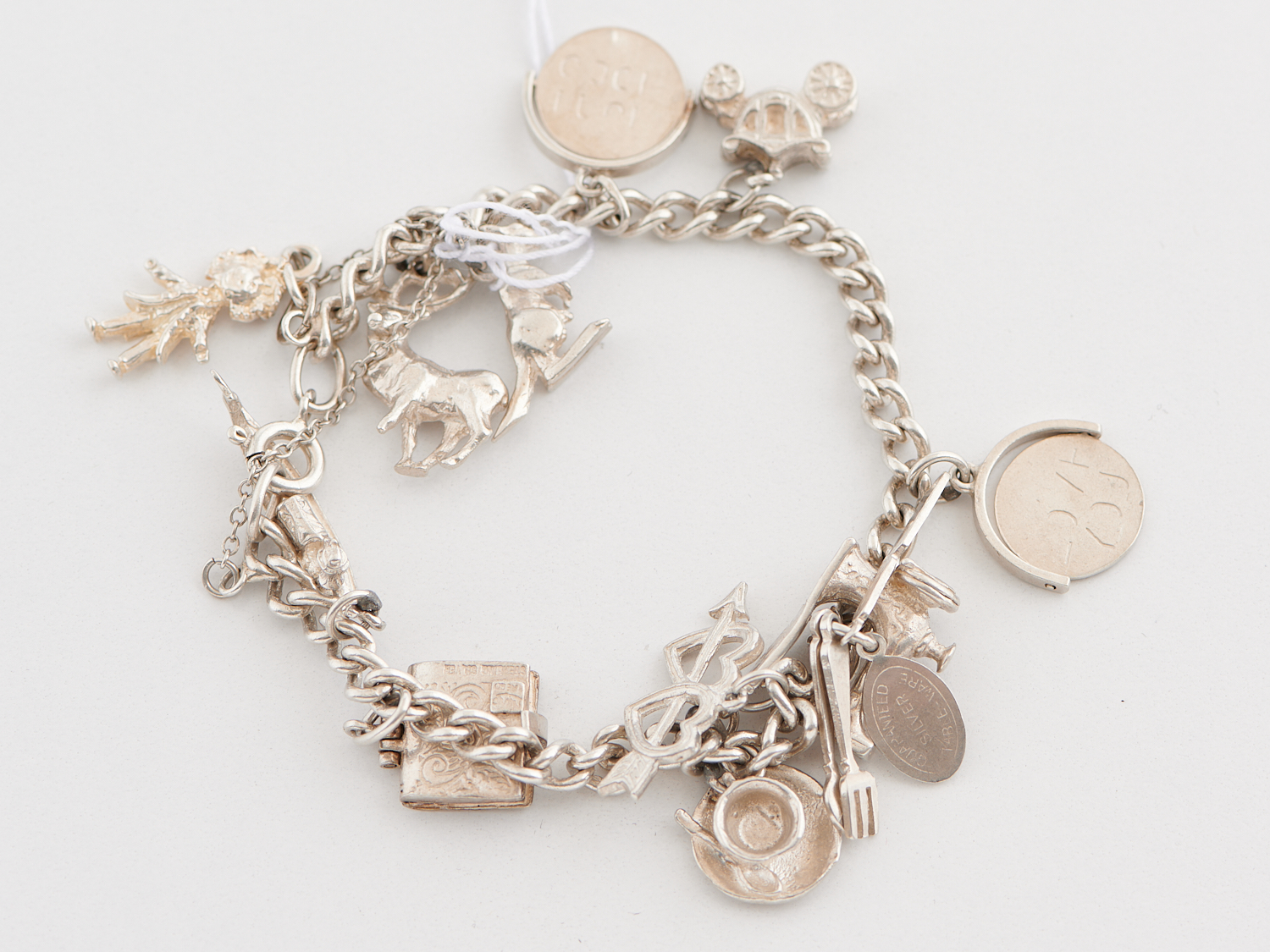 A CHARM BRACELET IN SILVER,WITH SAFETY CHAIN, TOTAL LENGTH 175MM