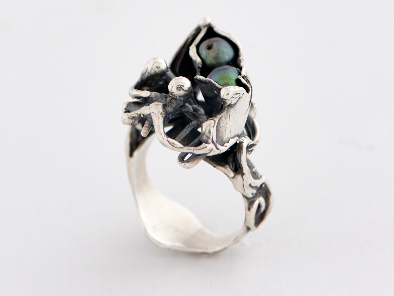 A PEARL RING IN SILVER ATTRIBUTED TO MATCHAM SKIPPER, RING SIZE N, WEIGHT 11.2GMS.